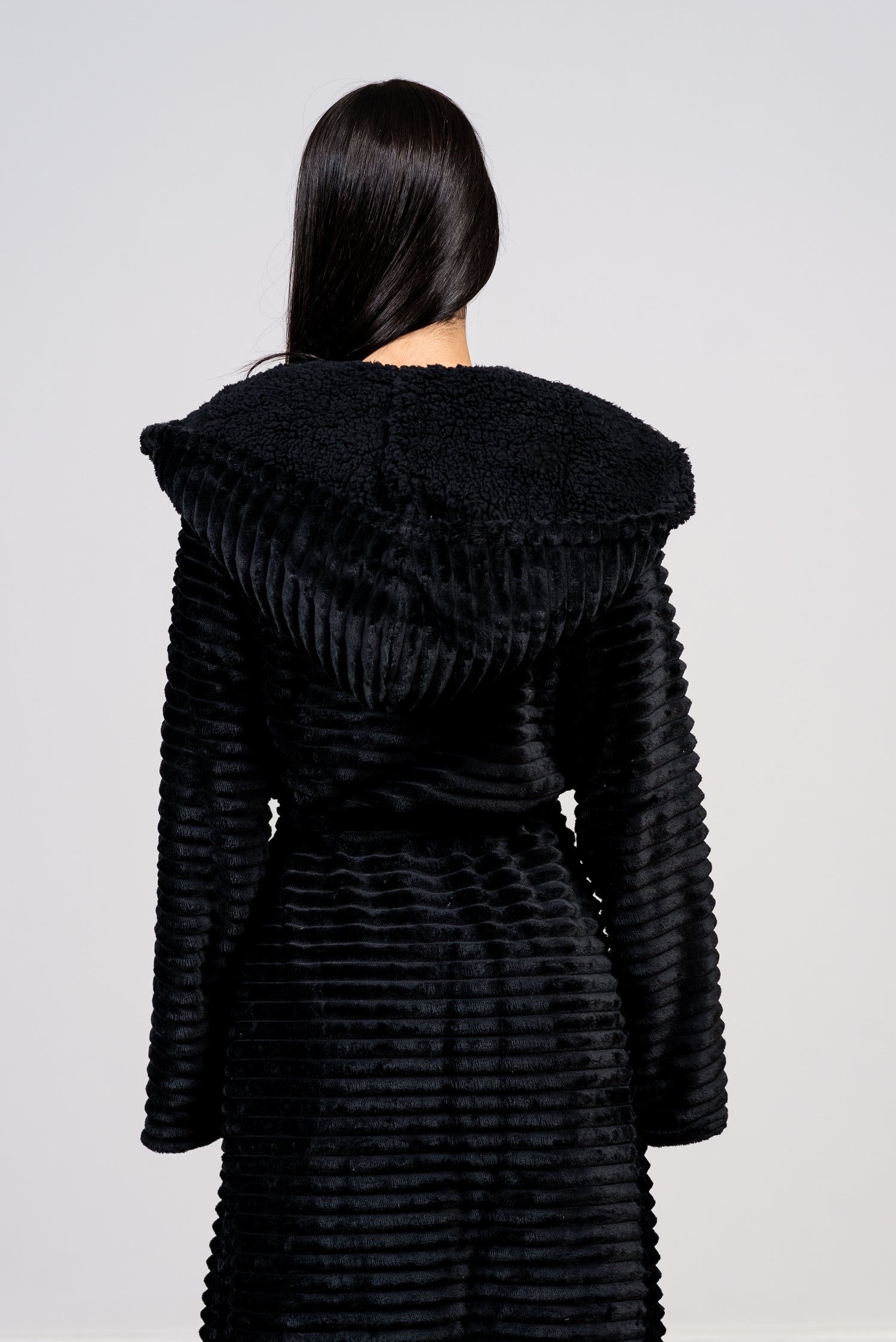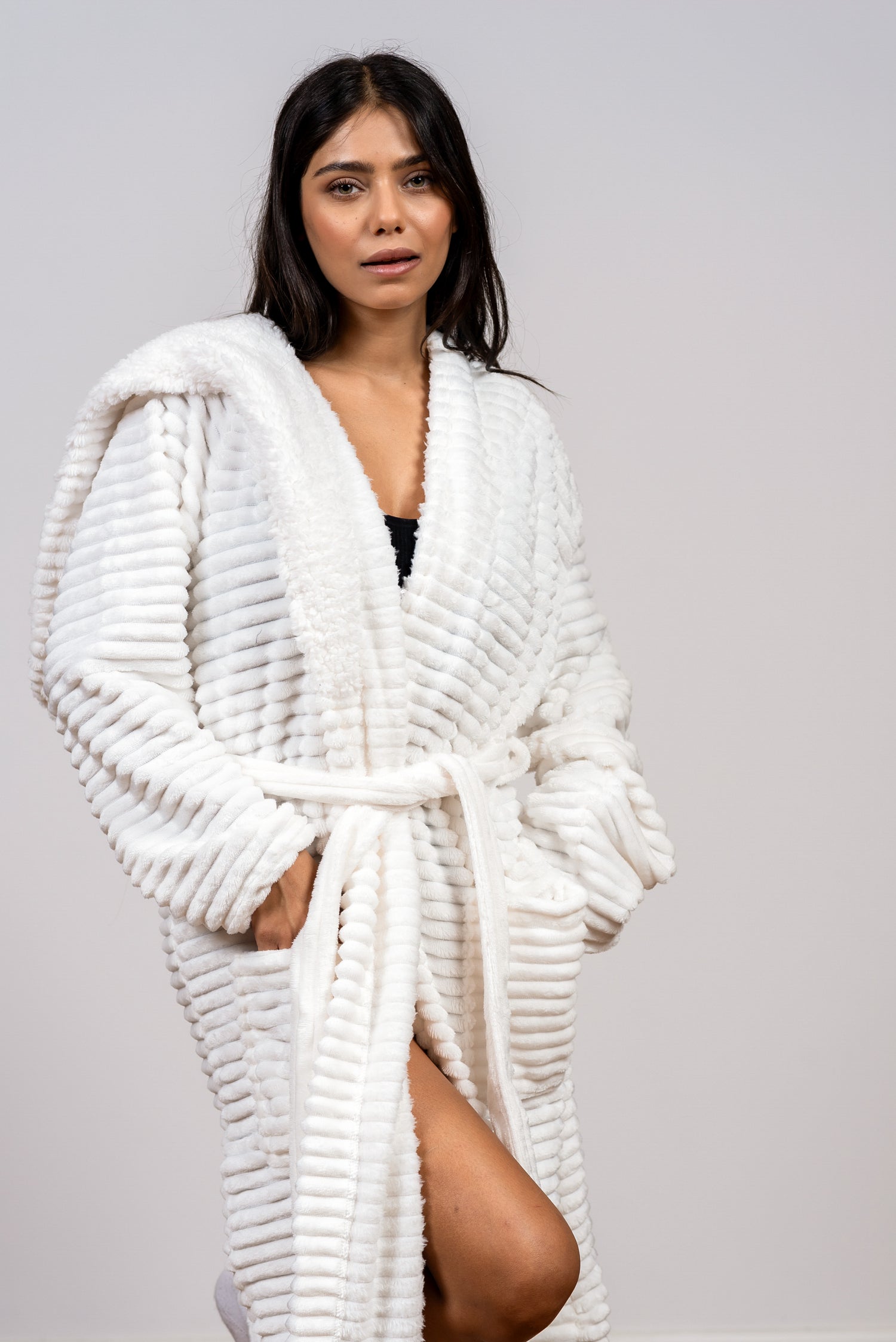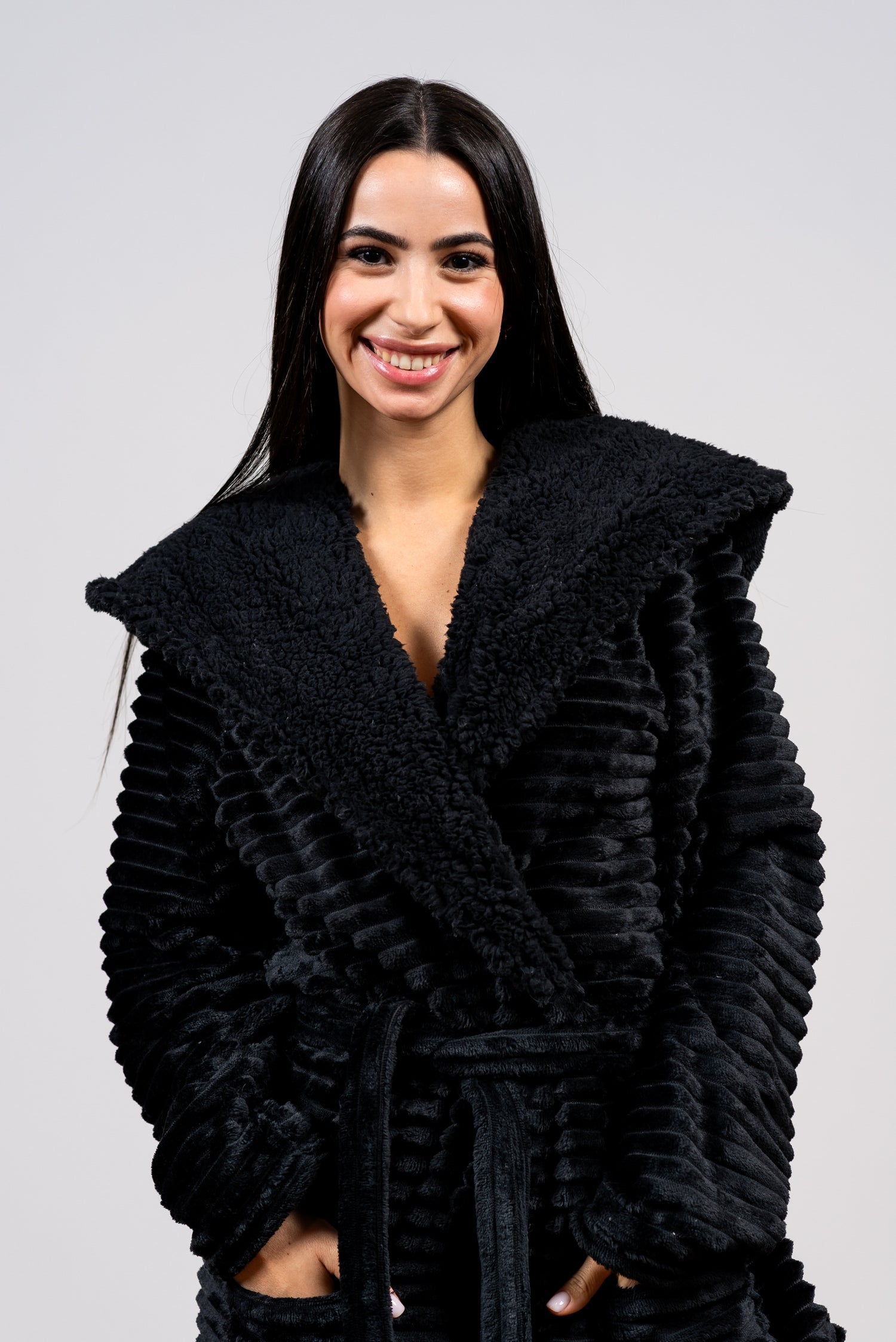 החלוק המושלם לימי החורף הקרים! חלוק הפליז הזה,  חלוק ארוך אשר מעניק חמימות מיידית ורכות מלטפת. הטקסטורה המפוספסת הייחודית מוסיפה לו שיק מודרני, והוא כולל קפוצ'ון עוטף לשמירה על חום הראש והצוואר. עם כיסים גדולים ורצועת קשירה מתכווננת, זהו החיבוק החם והמפנק שתחכי לו בכל ערב.
