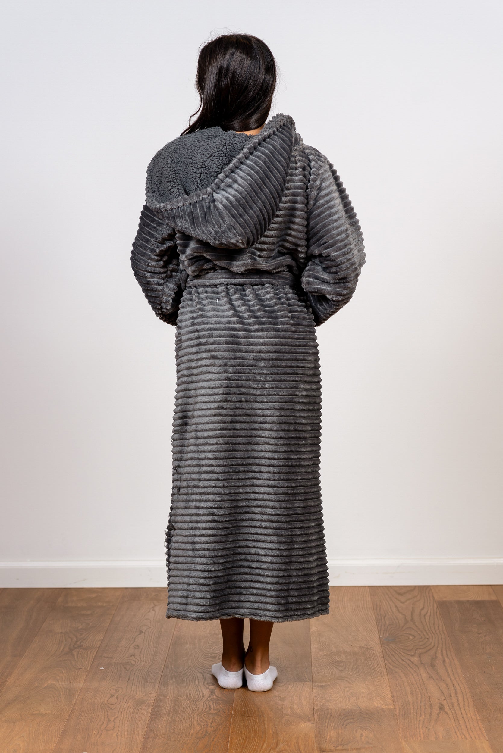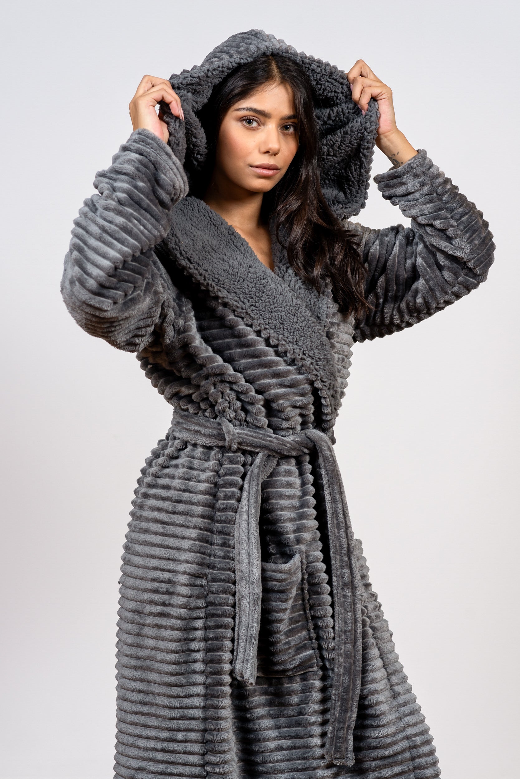 החלוק המושלם לימי החורף הקרים! חלוק הפליז הזה,  חלוק ארוך אשר מעניק חמימות מיידית ורכות מלטפת. הטקסטורה המפוספסת הייחודית מוסיפה לו שיק מודרני, והוא כולל קפוצ'ון עוטף לשמירה על חום הראש והצוואר. עם כיסים גדולים ורצועת קשירה מתכווננת, זהו החיבוק החם והמפנק שתחכי לו בכל ערב.