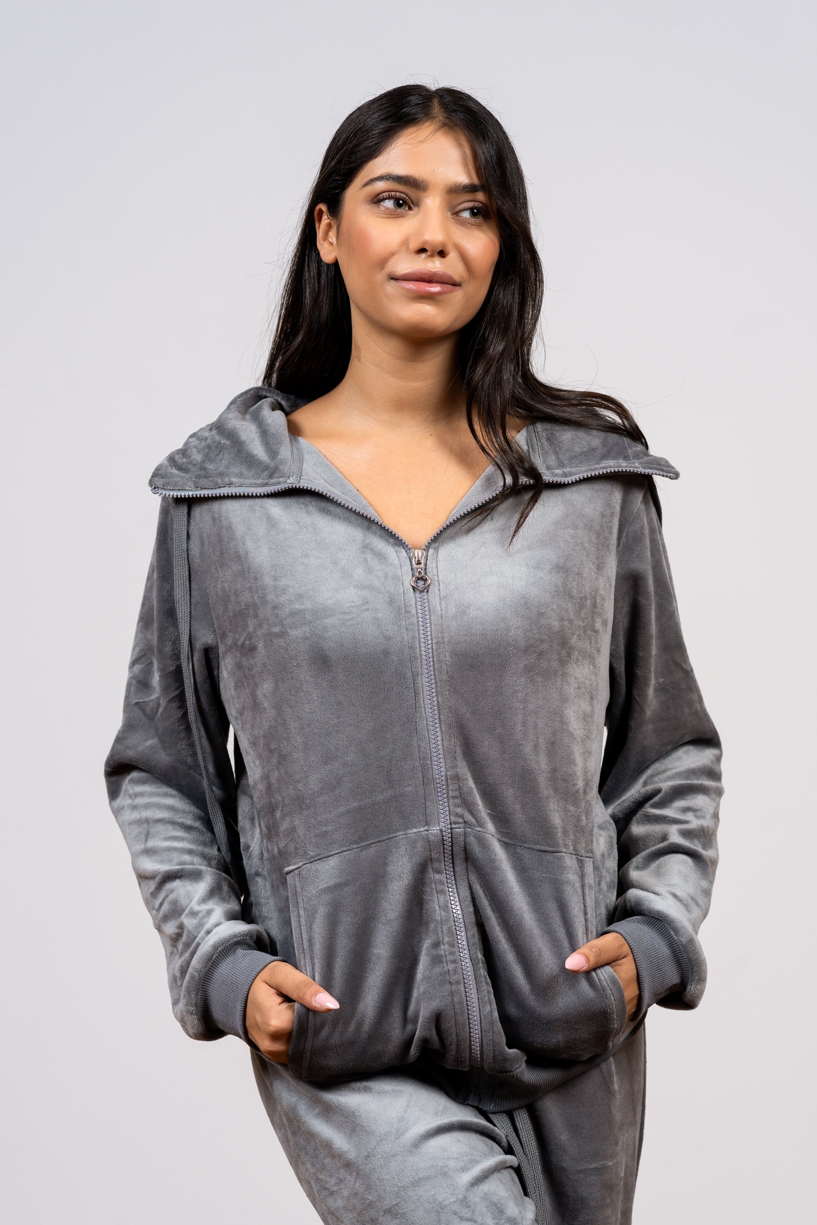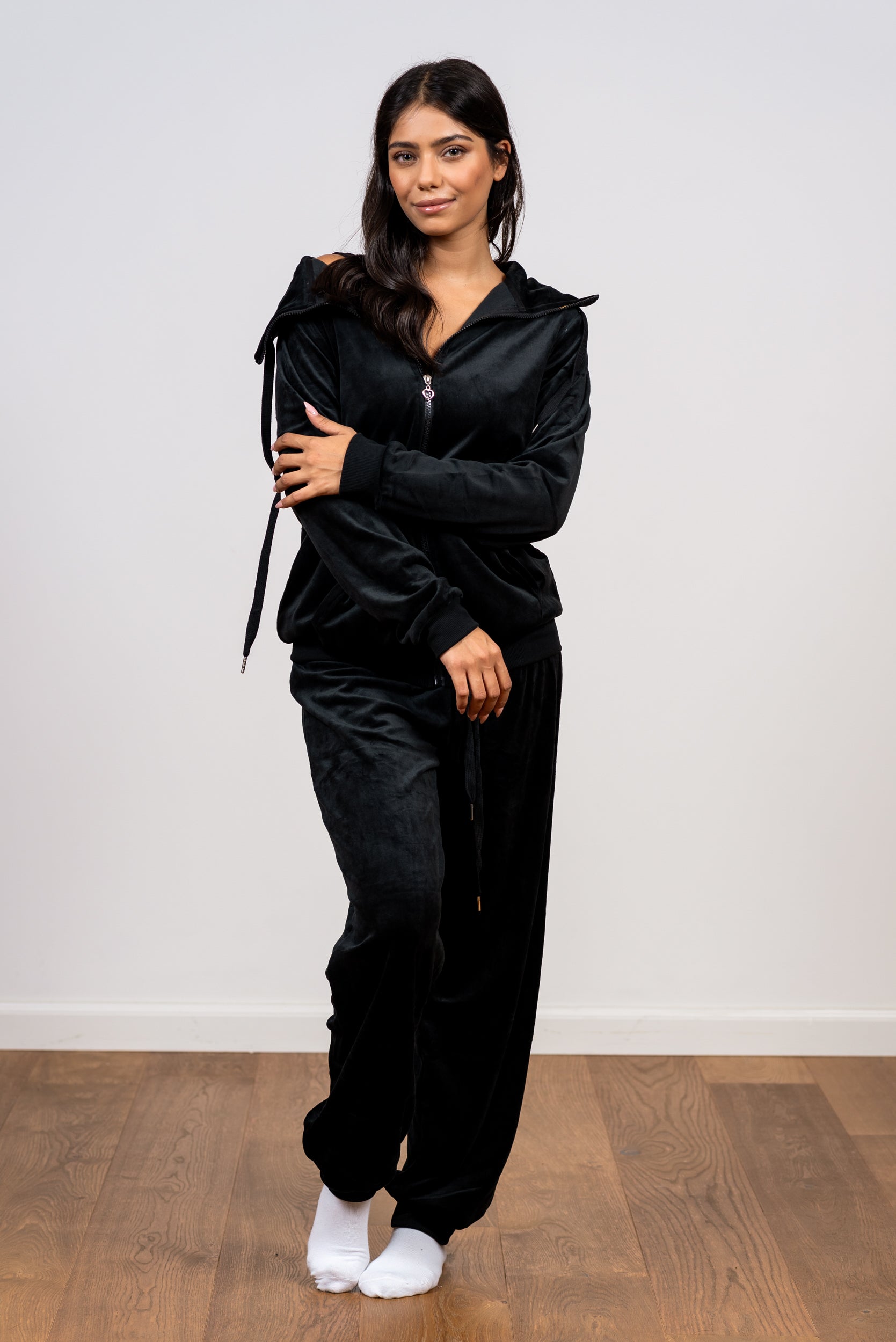 הכירו את פיג'מת הקטיפה שתיקח אתכן מהמיטה לסלון ובחזרה, בסטייל מושלם. סט הטרנינג הספורטיבי הזה עשוי מבד קטיפה מפנק ורך במיוחד, ומציע נוחות מקסימלית עם גזרה טרנדית: ג'קט רוכסן עם צווארון עומד ומכנס ג'וגר תואם. זוהי פריט חובה לחורף, המשלב את החמימות האולטימטיבית של בגד שינה עם המראה השיקי והנינוח של טרנינג יוקרתי. מושלם לשינה, ללבוש ביתי נוח ואפילו ליציאות קצרות בסטייל מחמם.