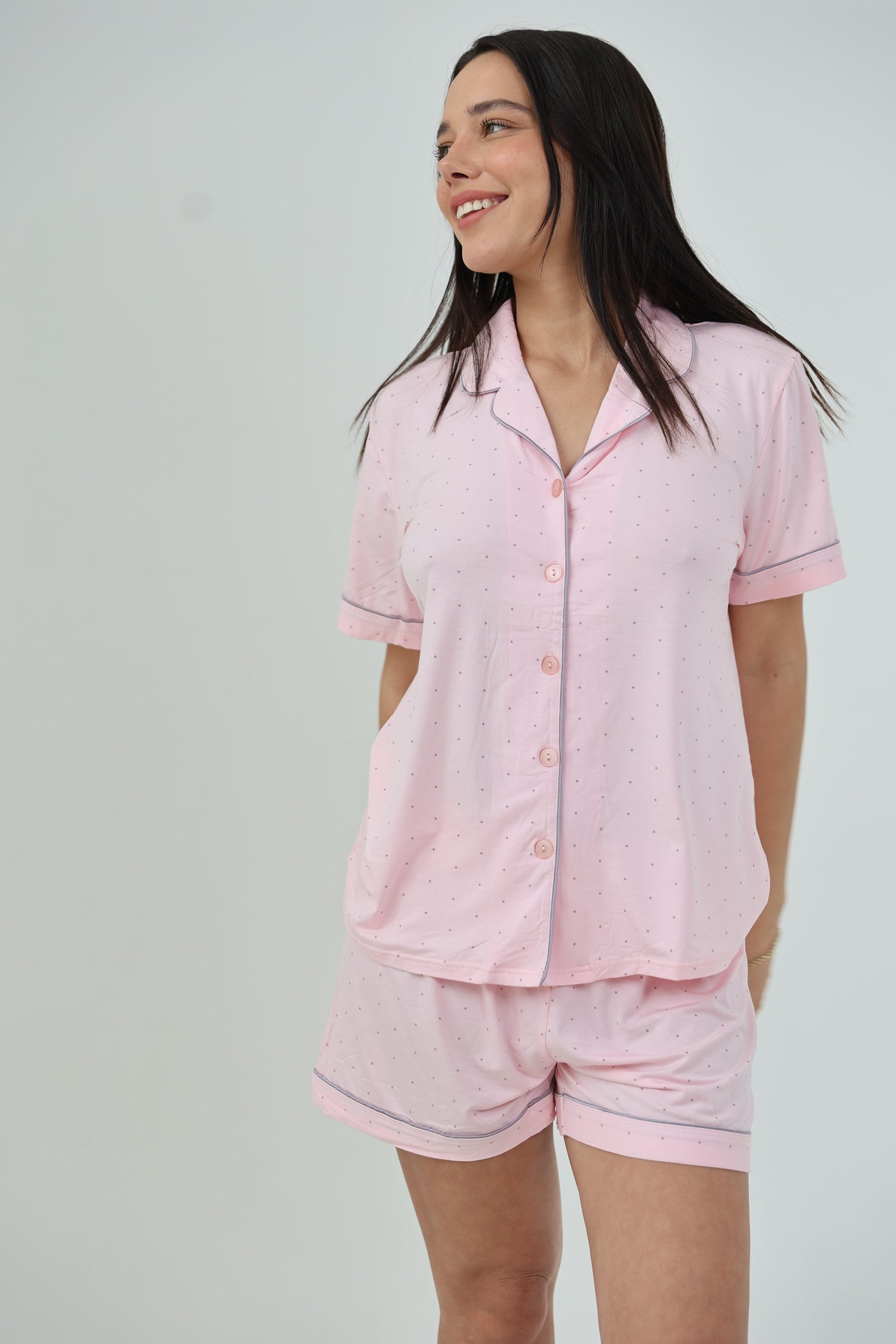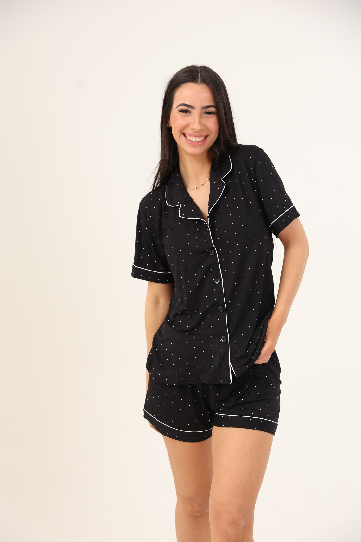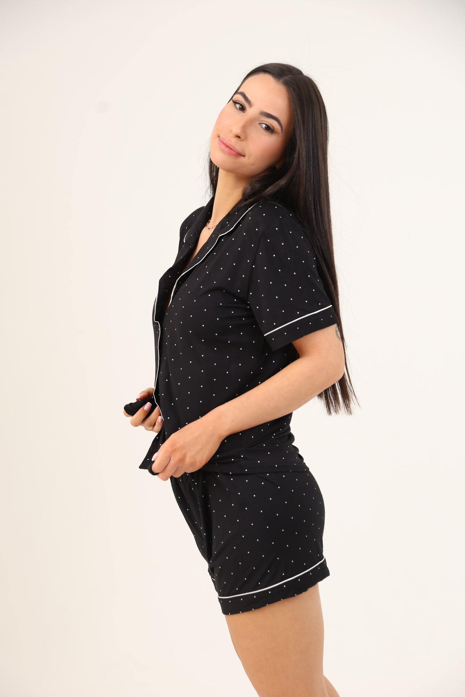 סט פיג'מה מודל מכנסון וחולצה מכופתרת נקודות