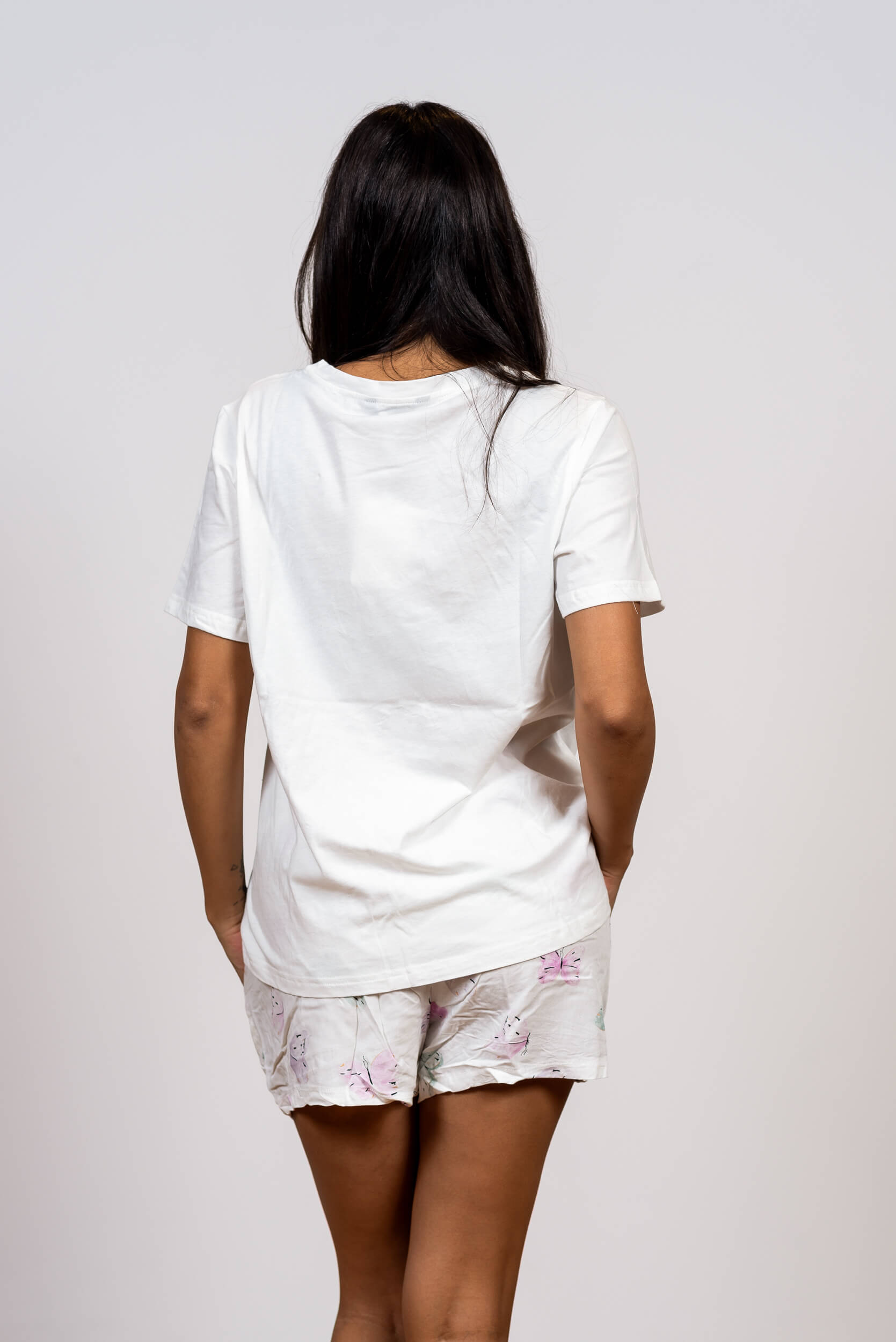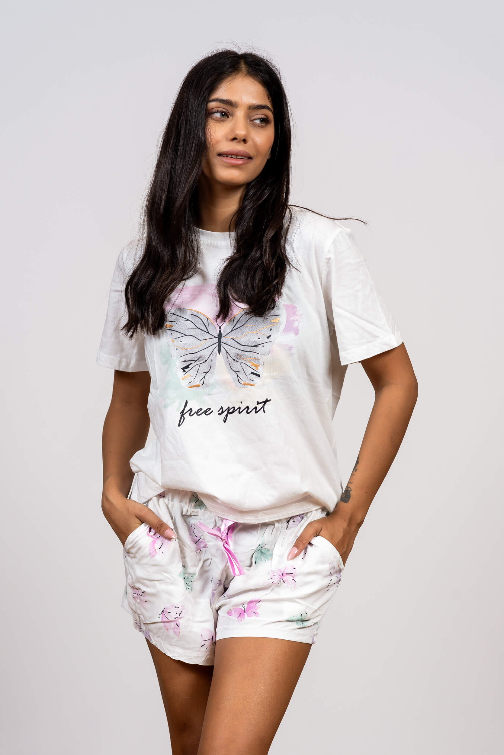 הסט משלב חולצת כותנה איכותית, רכה ונושמת שמלטפת את הגוף, יחד עם מכנסי ויסקוזה קלילים בהדפס פרפרים תואם. הבד הנשפך של המכנסיים, בשילוב עם גומי גמיש וסרט קשירה ורוד ורומנטי במותן, מבטיח התאמה מושלמת ונוחות ללא פשרות לאורך כל הלילה. את יכולה לבחור בין הגוון הלבן הקלאסי לבין הירוק-מינט המרגיע והמיוחד