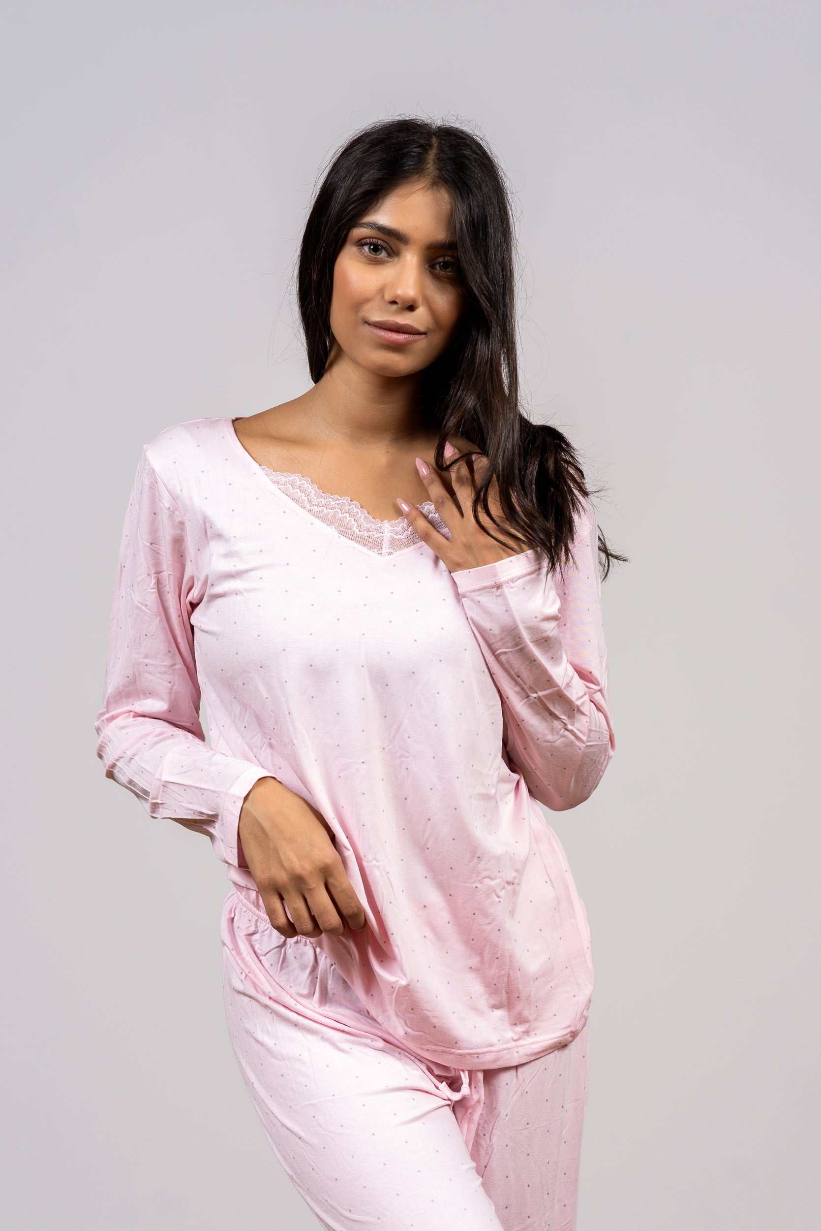 הסט מעוצב בגזרה נינוחה ומחמיאה: החלק העליון כולל מפתח וי עדין, המעוטר בגימור תחרה אלגנטי שמוסיף נגיעה רומנטית וייחודית. המכנסיים ארוכים, בגזרה ישרה ורחבה, עם שרוך קשירה במותן להתאמה אישית ונוחות מקסימלית