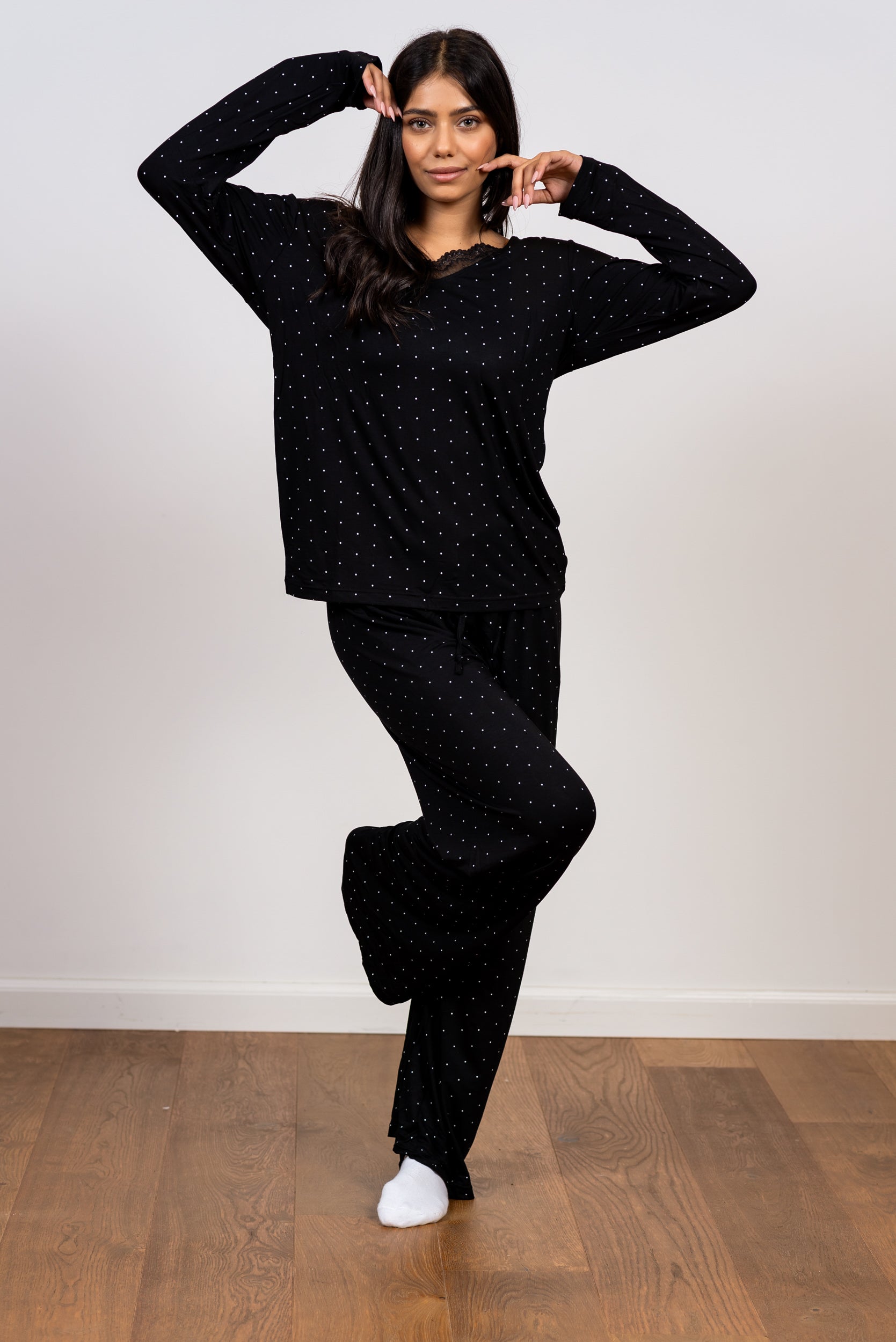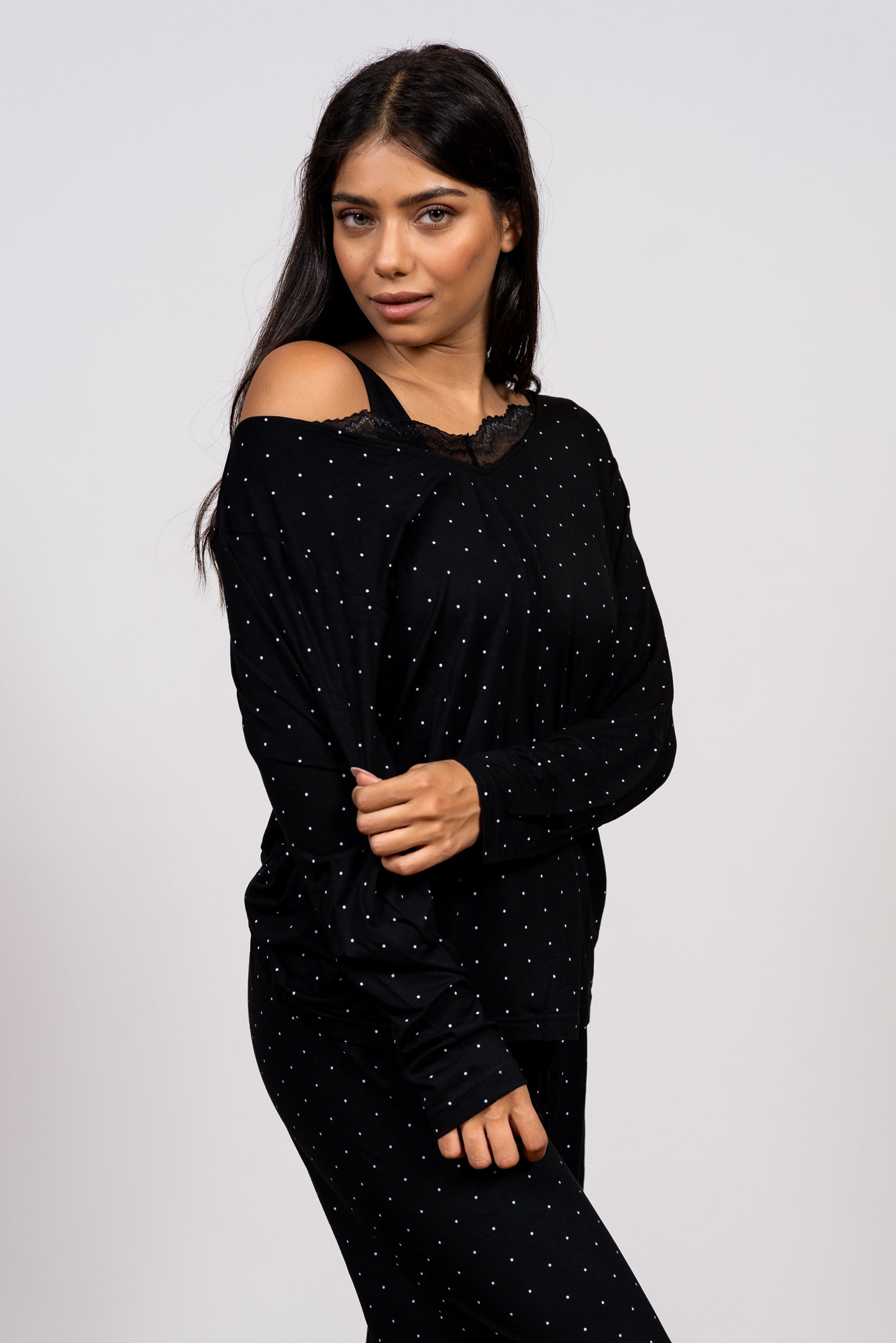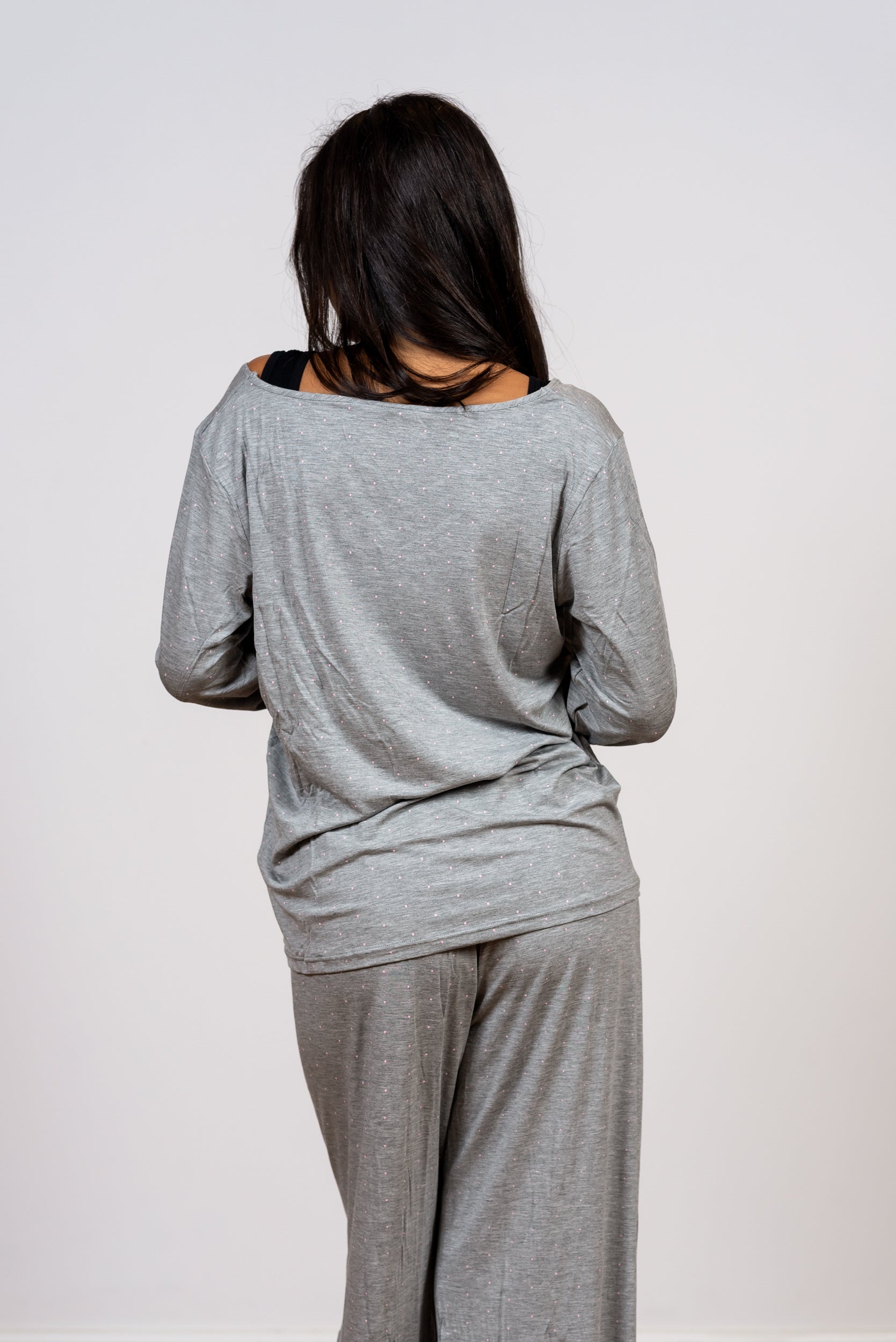 הדפס הנקודות הקלאסי והעדין מעניק לפיג'מה קריצה מתוקה ועל - זמנית. זוהי הבחירה האידיאלית למי שמחפשת סט מפנק, נעים וסופר-שיקי, שכיף ללבוש גם בערב רגוע בבית וגם בבוקר של סוף שבוע