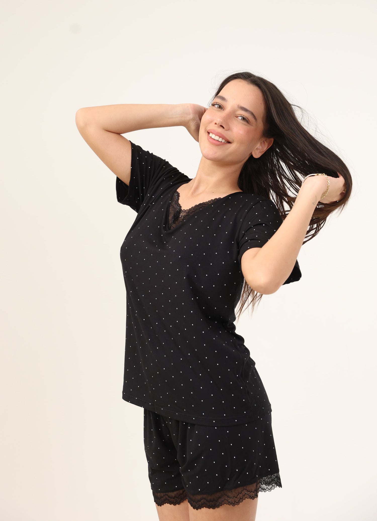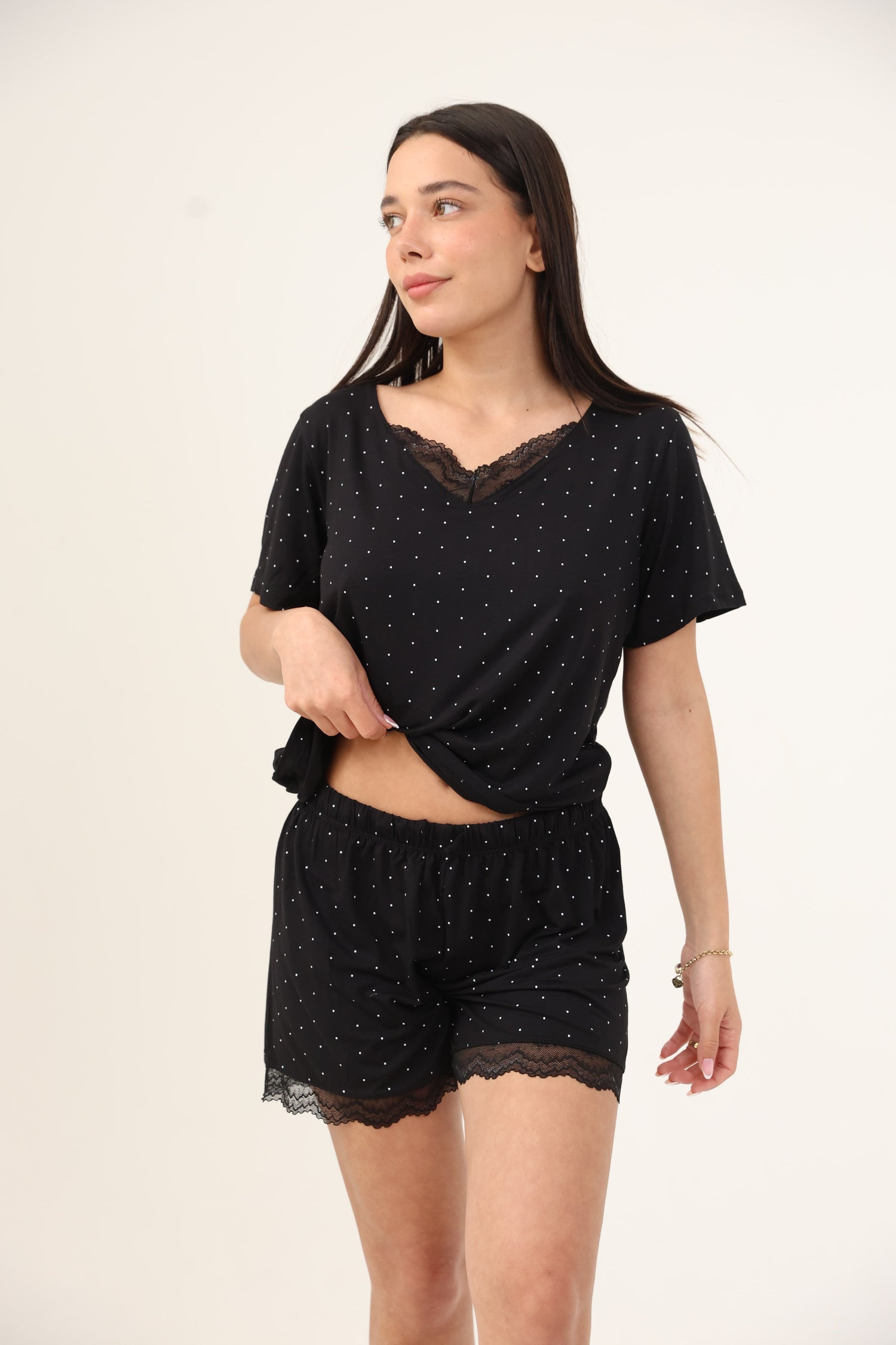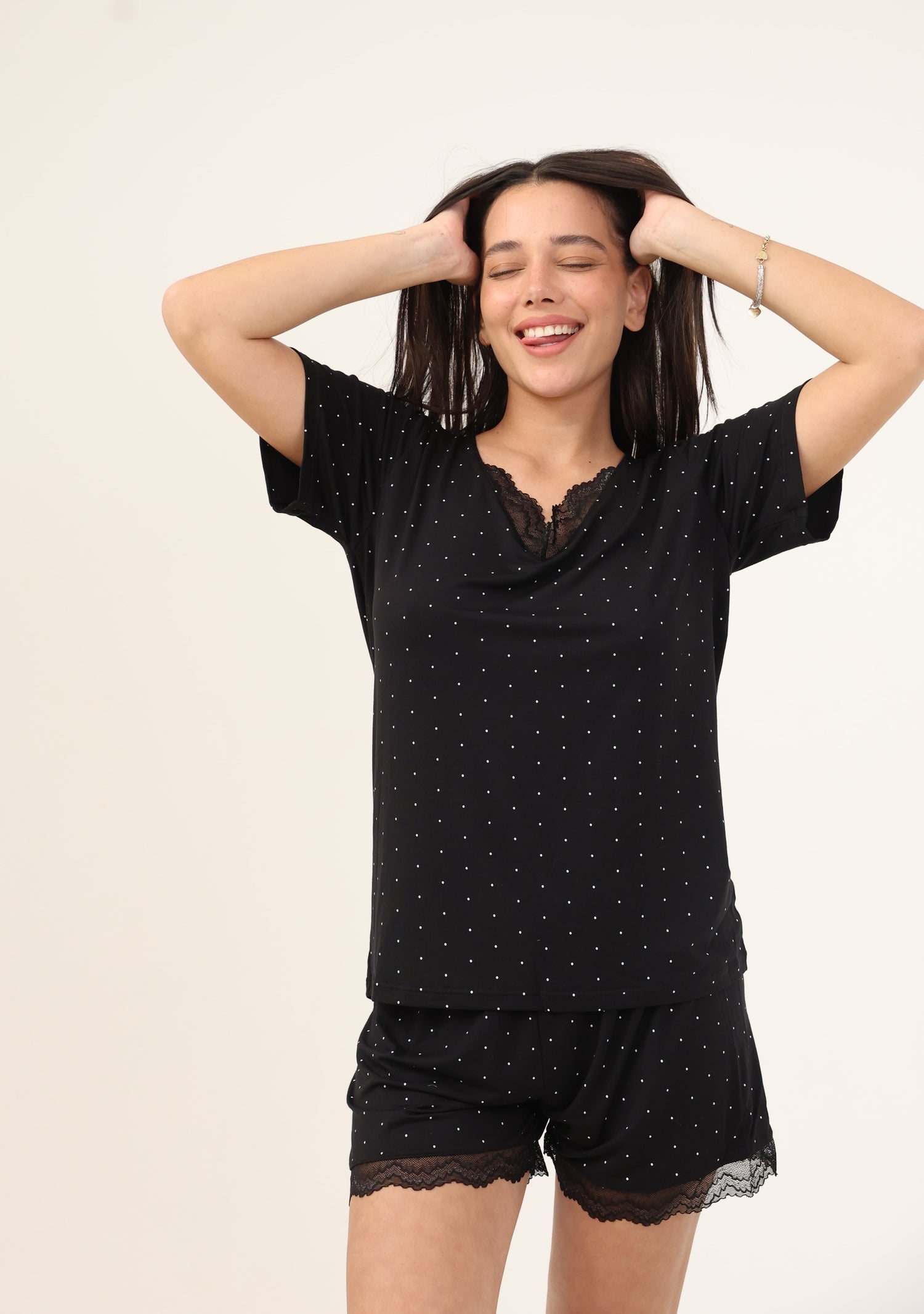 סט פיג’מה קייצי ונעים במיוחד מבד שייני גמיש ונושם. כולל חולצת טי עם מפתח וי מעוטר בתחרה שחורה עדינה, בשילוב מכנס קצר עם גומי נוח במותן ותחרה תואמת בקצה. ההדפס המנוקד מוסיף טאץ’ שובבי ואלגנטי. מושלם ללילות נינוחים וסטייל יומיומי בבית. הדוגמנית לובשת מידה S.