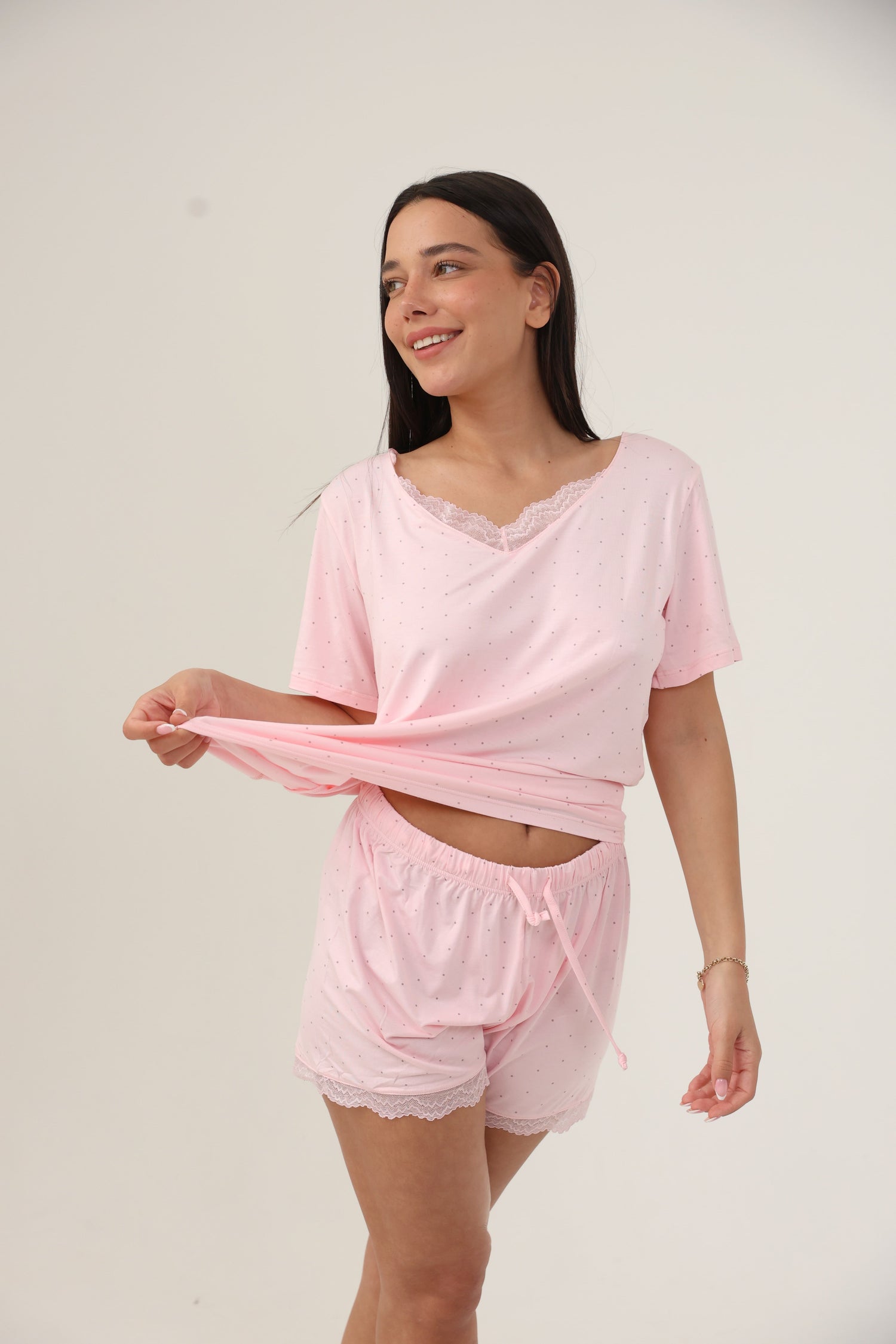 סט פיג'מה מבד מודל מכנסון וחולצה נקודות