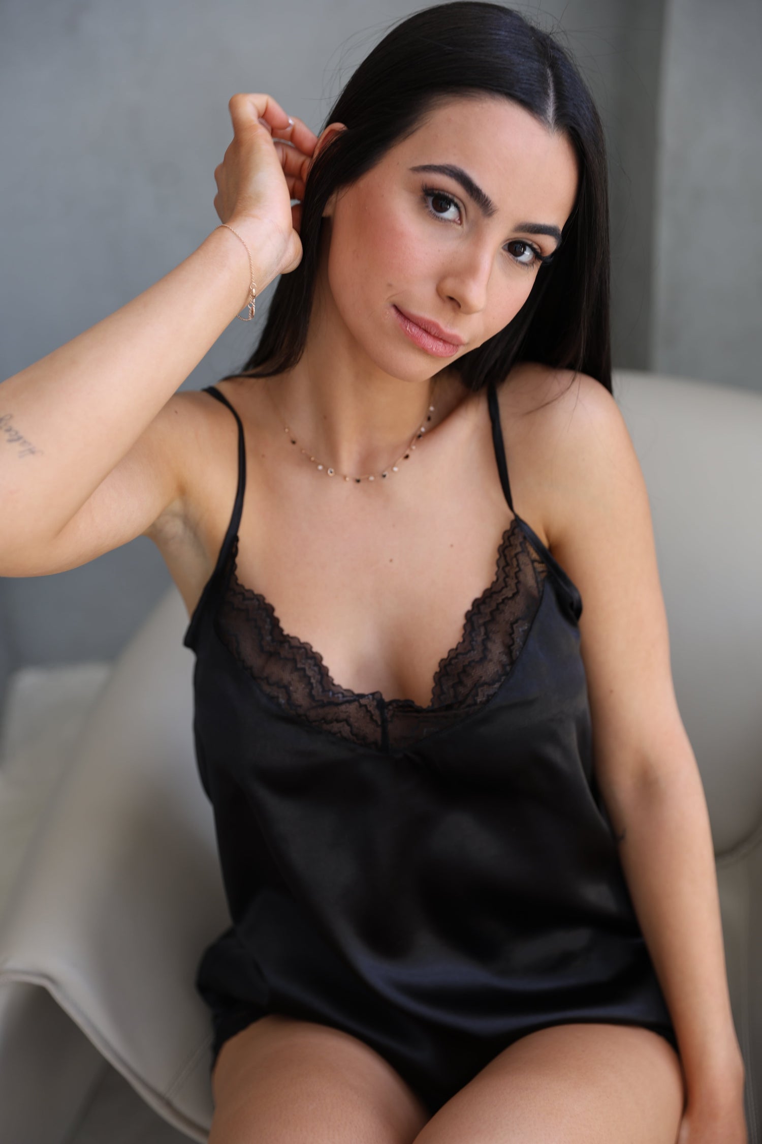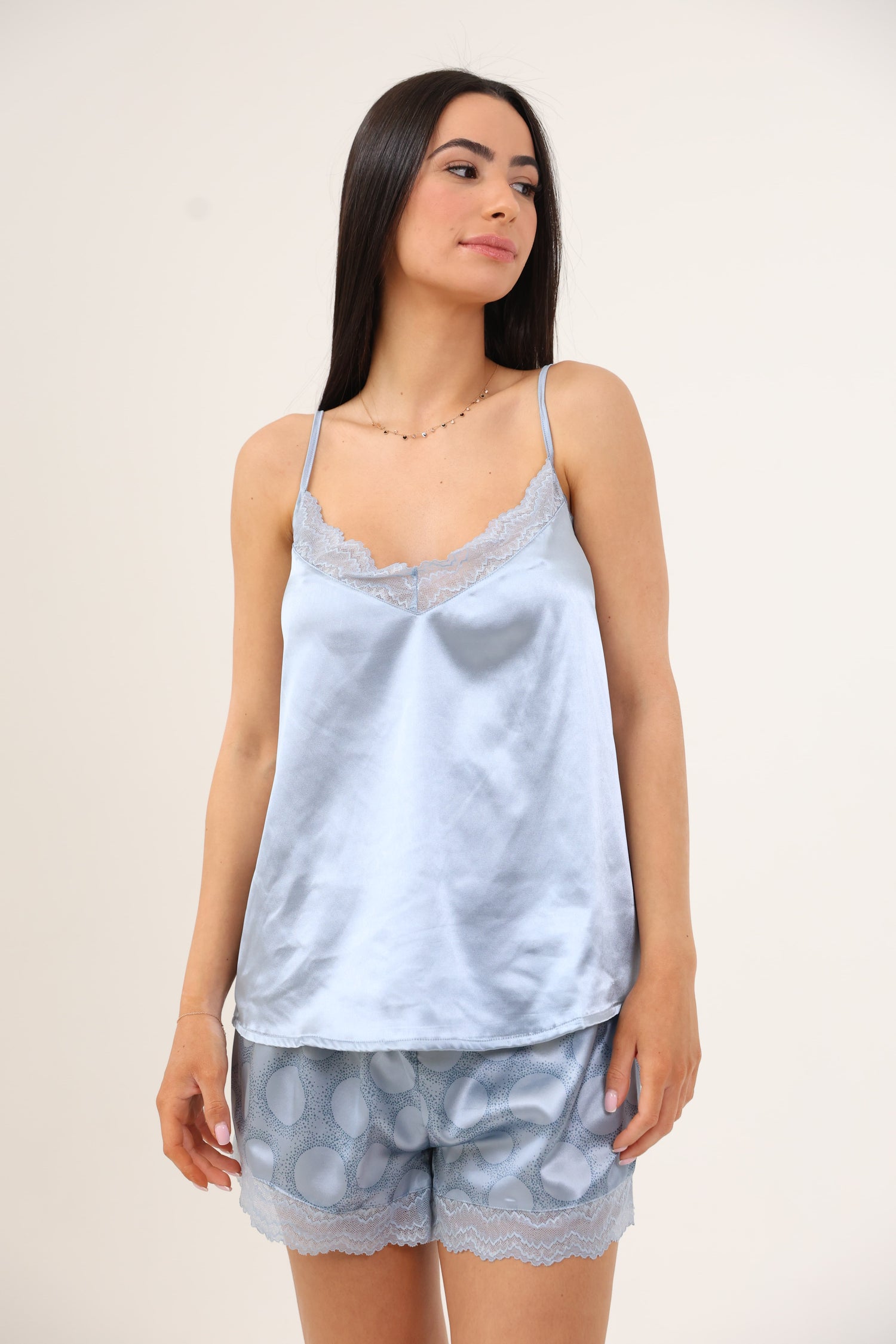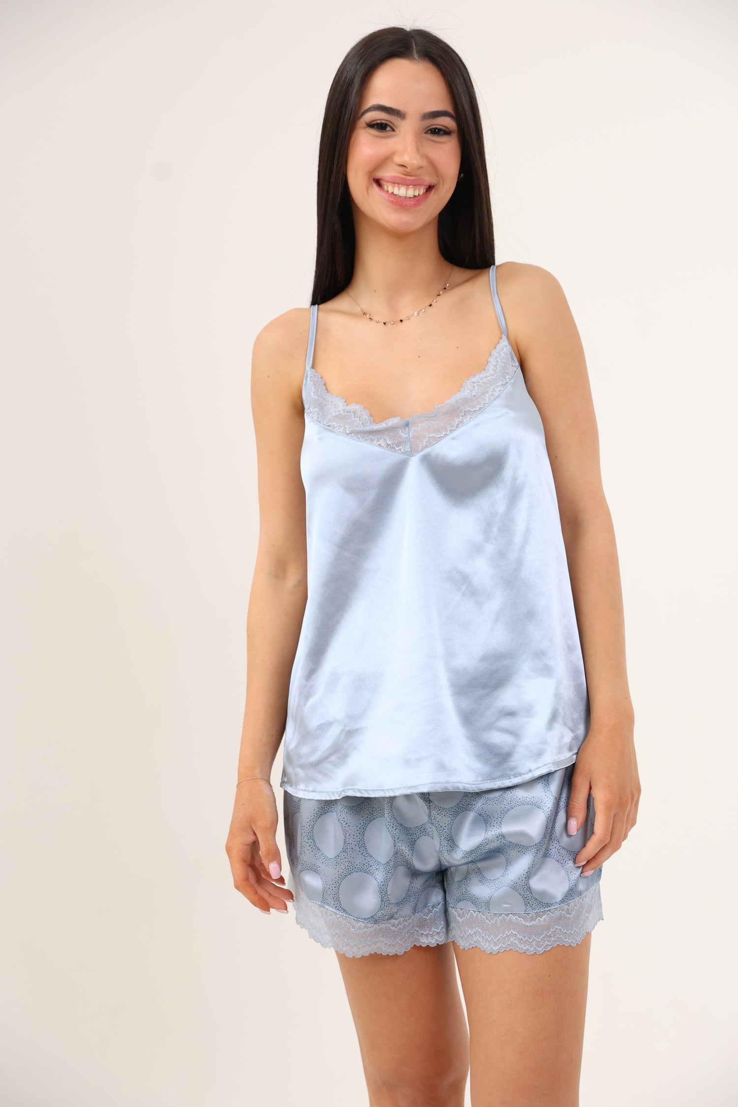 סט פיג'מת סאטן דו-חלקי הכולל גופייה נשית בגזרת V עם כתפיות דקות ועיטור תחרה עדין, יחד עם מכנסון קצר בגזרה נוחה עם הדפס עיגולים ייחודי וסיומת תחרה רכה למראה מרענן ומלא שיק. עשוי מבד סאטן רך ומלטף שמרגיש נהדר על הגוף – מושלם ללילות של סטייל ונוחות. הדוגמנית לובשת מידה S.