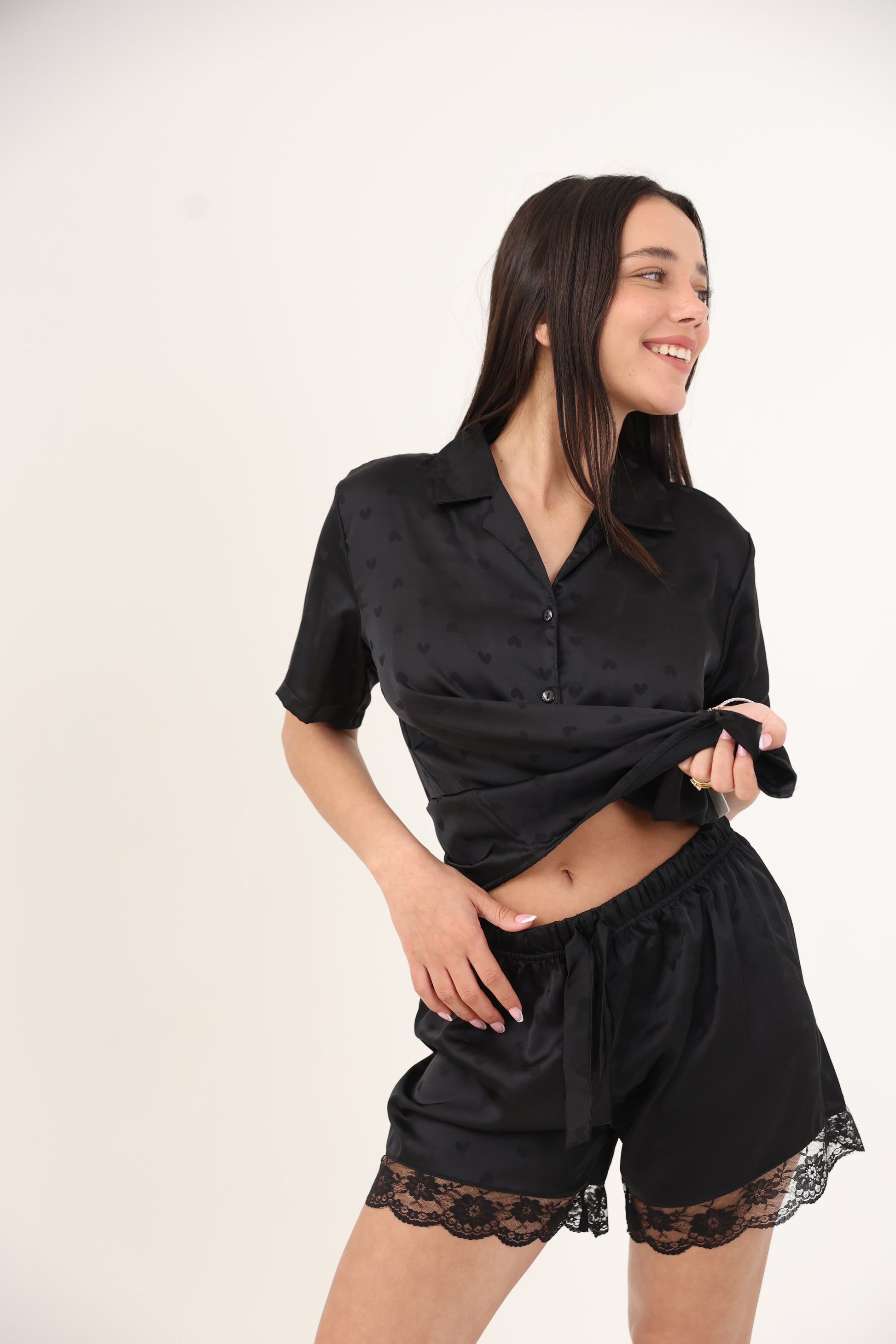 סט פיג'מה דו-חלקי מבד סאטן מבריק ורך במיוחד, בגזרה מחויטת הכוללת חולצה מכופתרת עם שרוול קצר והדפס לבבות עדין למראה רומנטי ומלא סטייל. המכנסון המשוחרר מגיע עם סרט קשירה במותן וסיומת תחרה מעודנת שמוסיפה טאץ' נשי ומדויק. מושלם ללילות מפנקים או לבוקר רגוע בבית.
