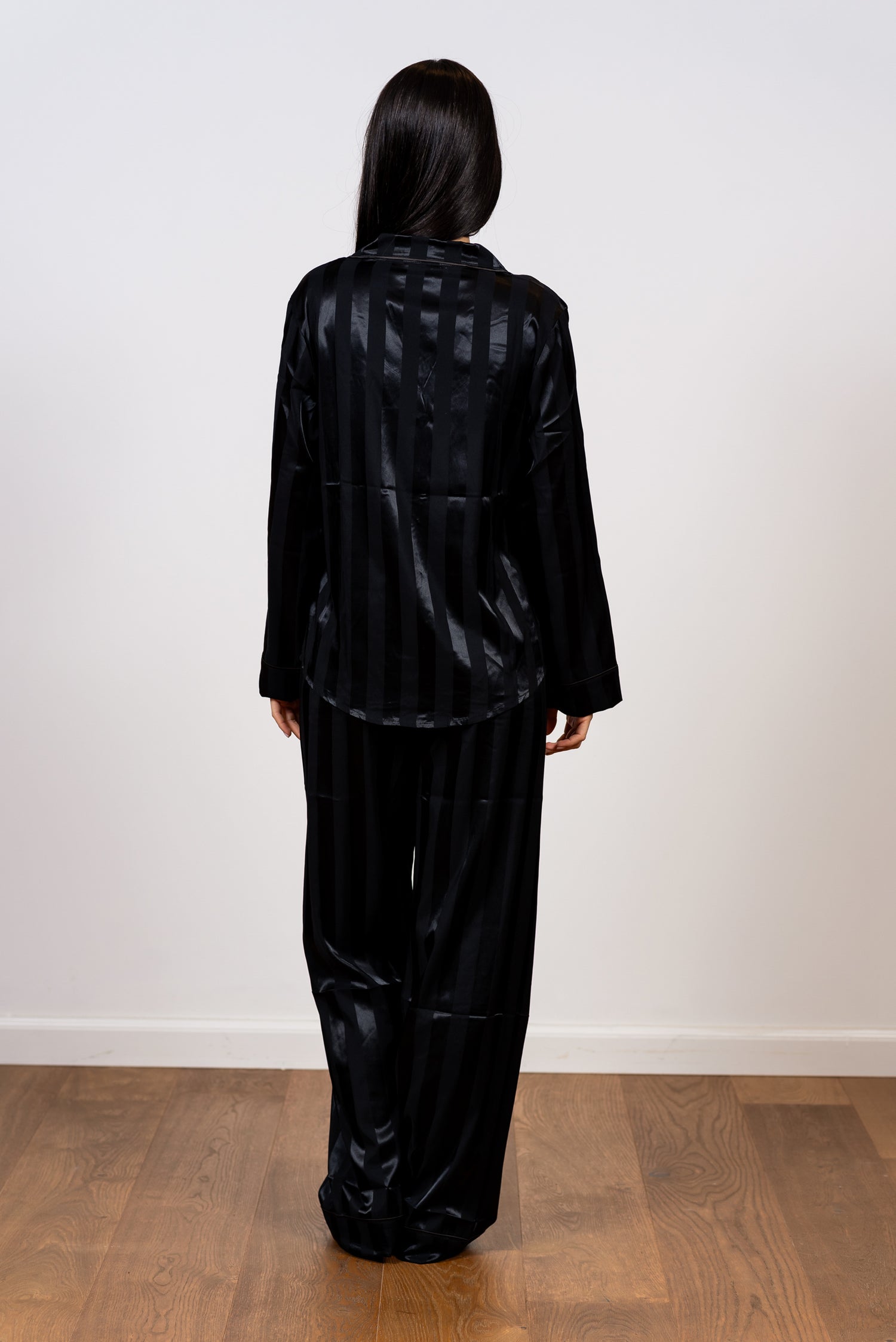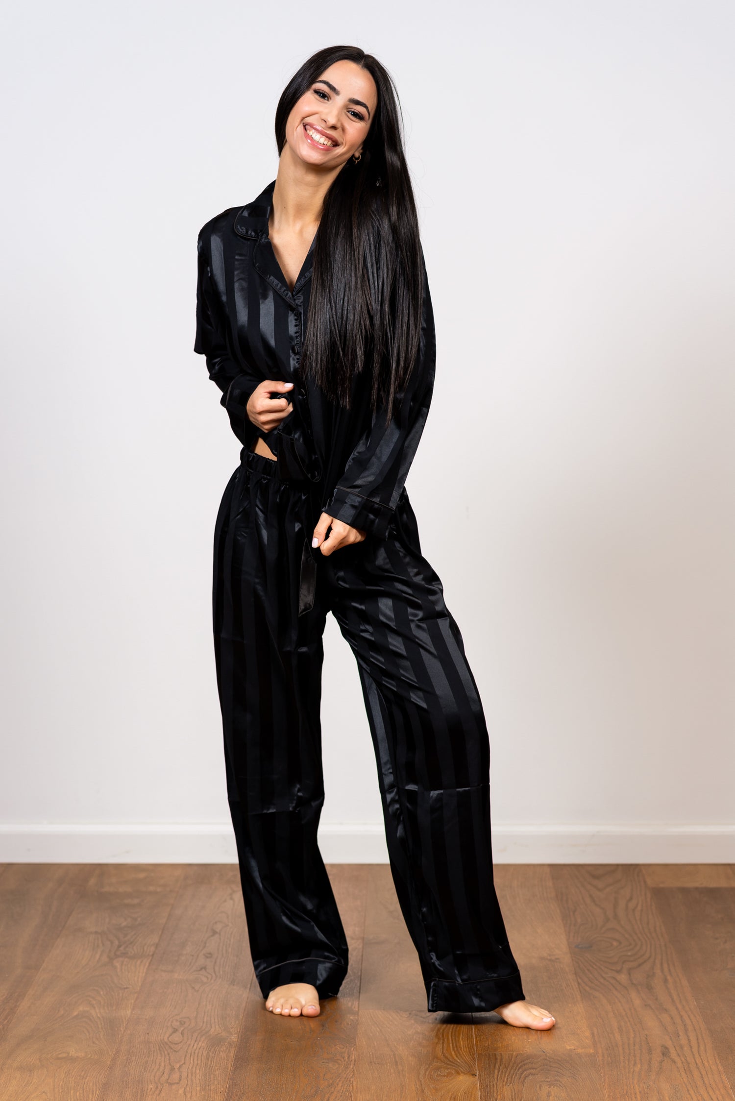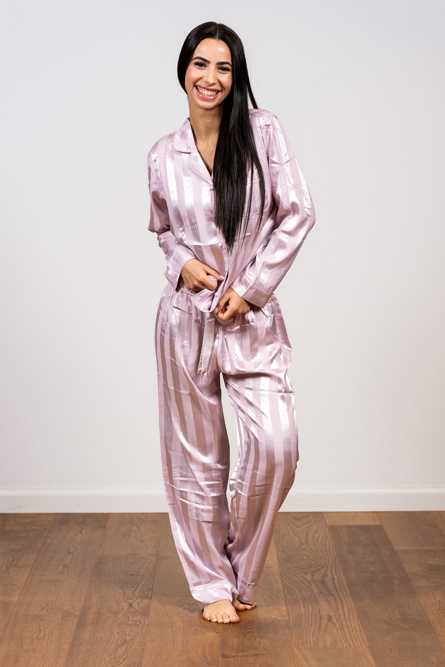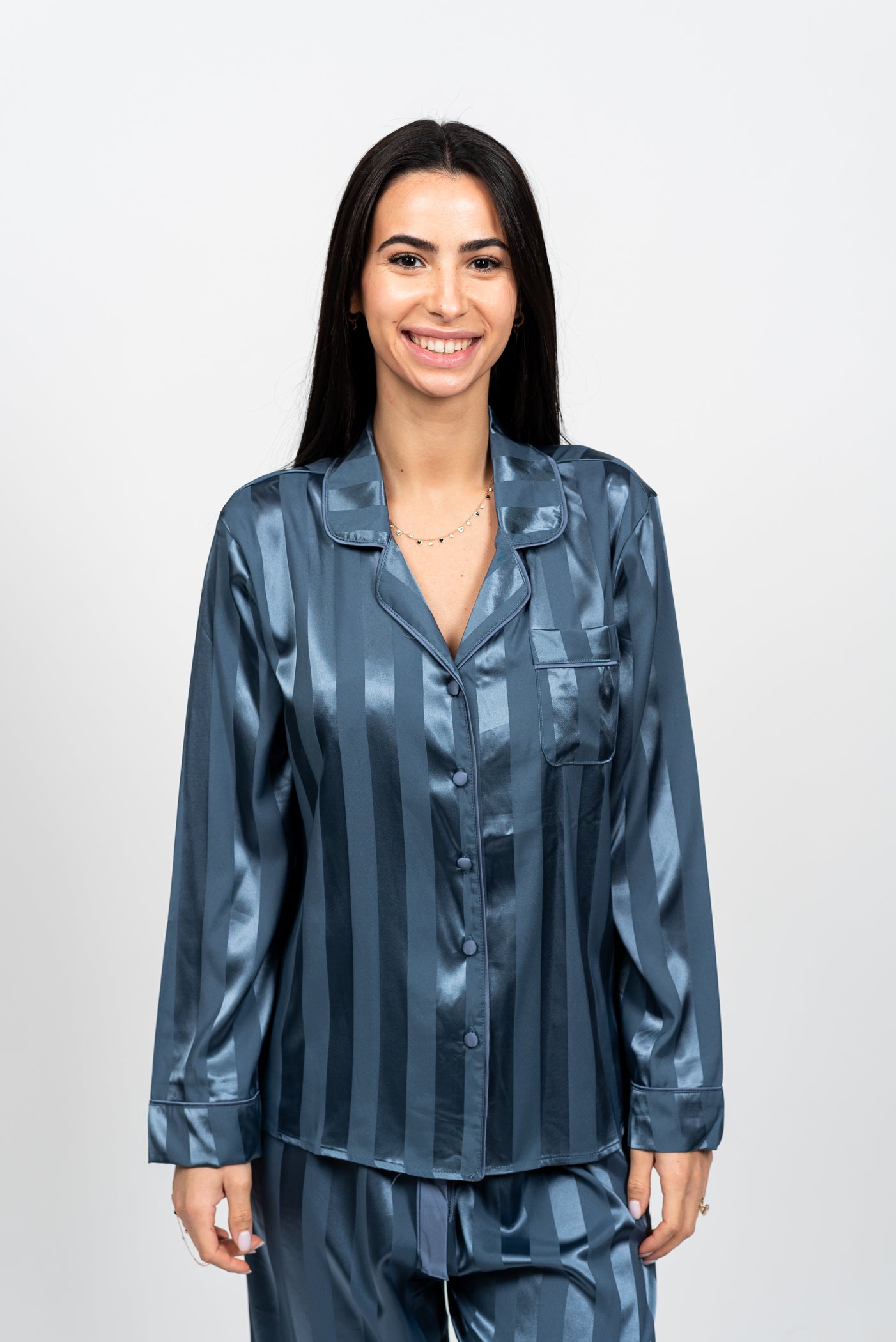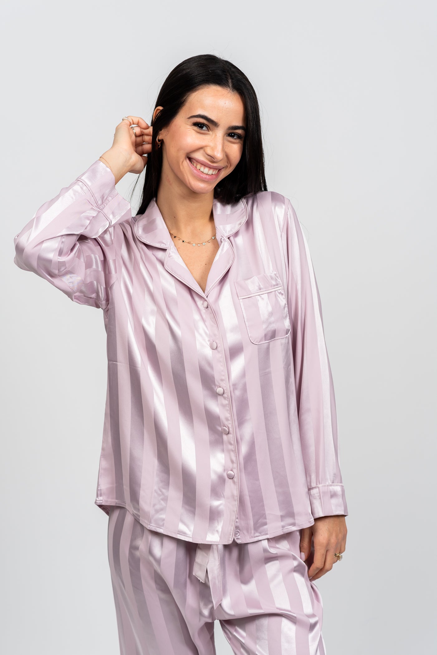 הדפס הפסים האנכיים, הנוצר ממשחקי ברק ומט בבד עצמו, מעניק מראה מתוחכם, מאריך ומחמיא. זוהי הבחירה המושלמת למי שמחפשת לשדרג את שעות הלילה והפנאי שלה בסטייל הוליוודי נצחי ובתחושת פינוק מלכותי