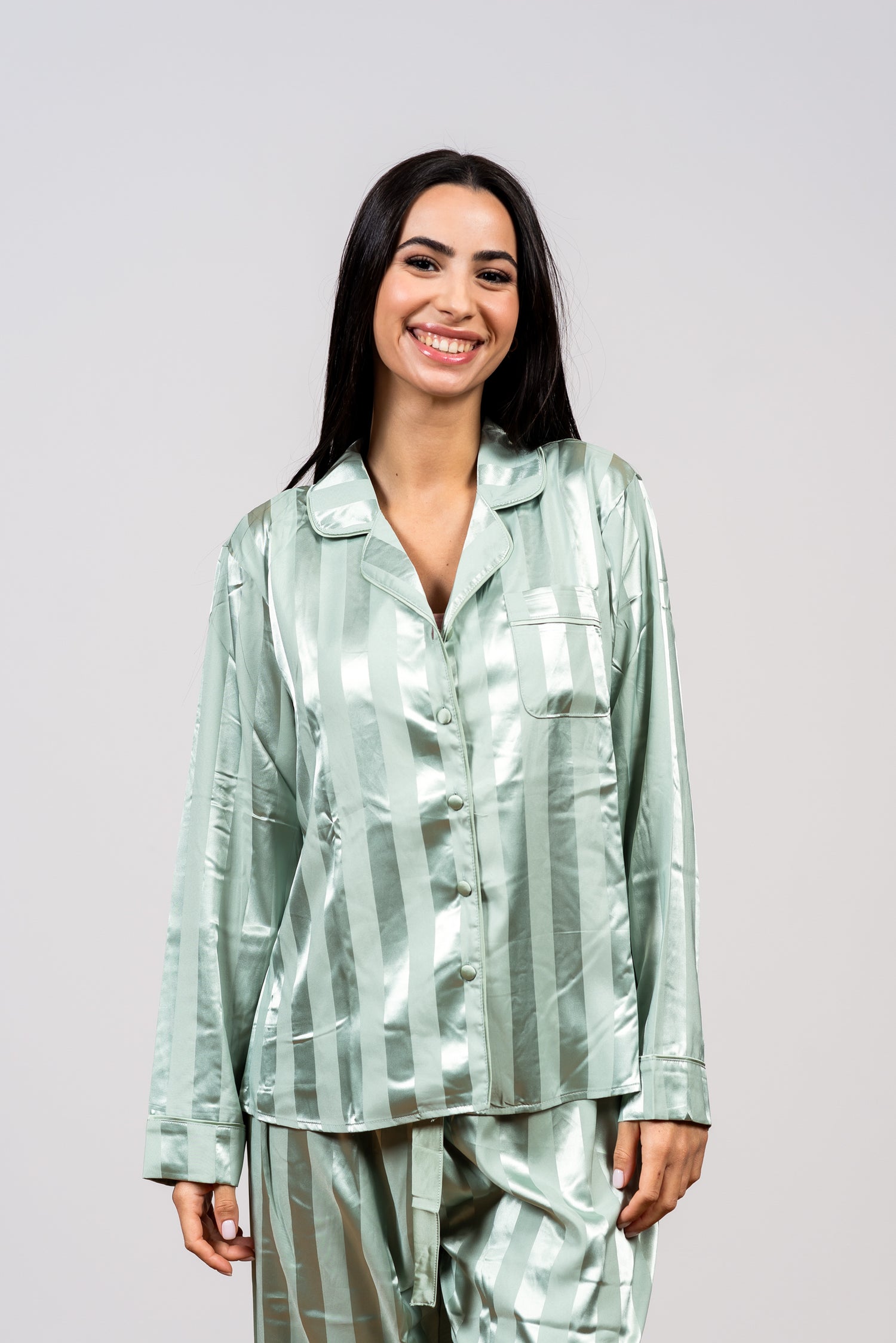 התגלמות היוקרה והסטייל הקלאסי. סט הפיג'מה הזה הוא כל מה שצריך כדי להרגיש אלגנטית ומפנקת ברגע. הוא עשוי מבד סאטן עשיר ויוקרתי, הזורם על הגוף ברכות ומעניק תחושה קרירה, חלקה ומלטפת. הברק העדין של הבד יוצר מראה זוהר ובלתי מתאמץ