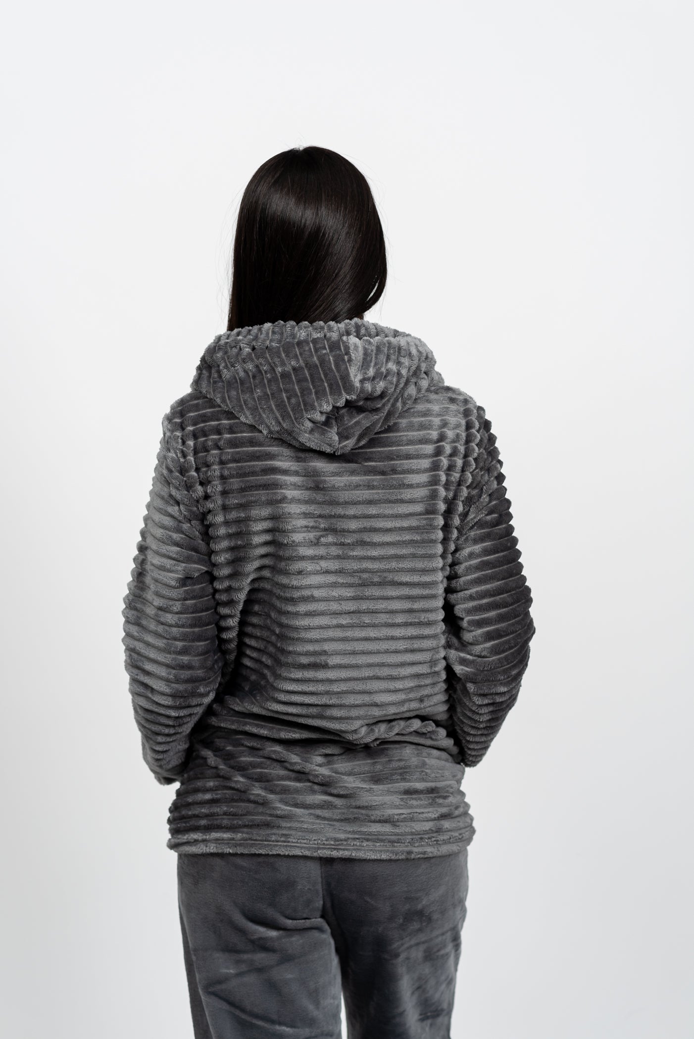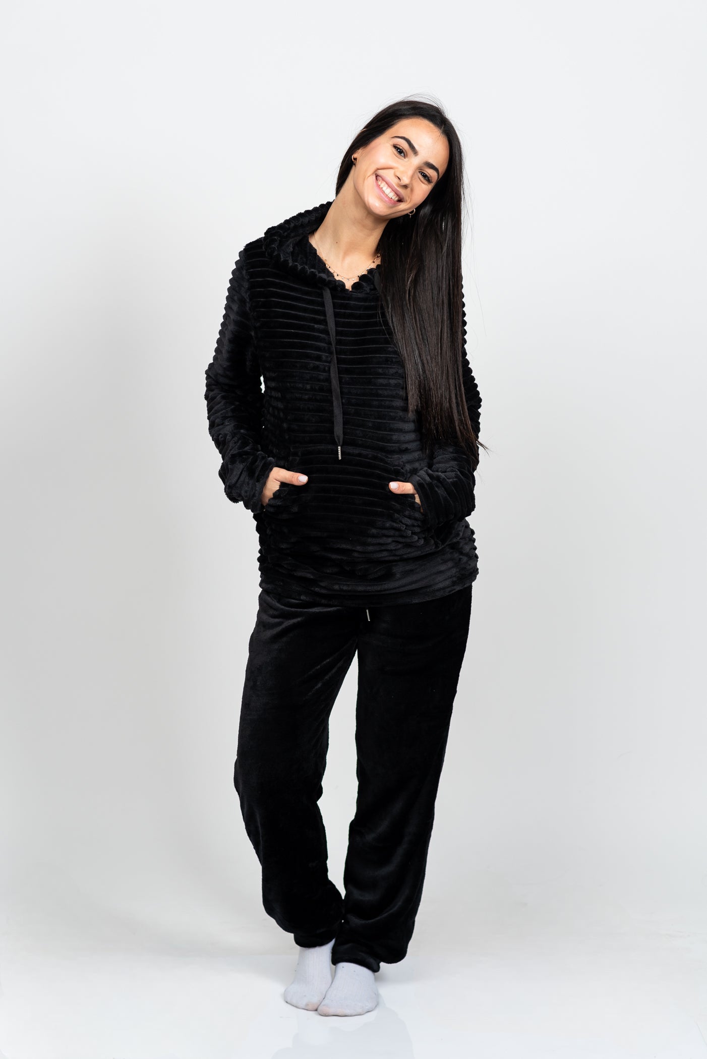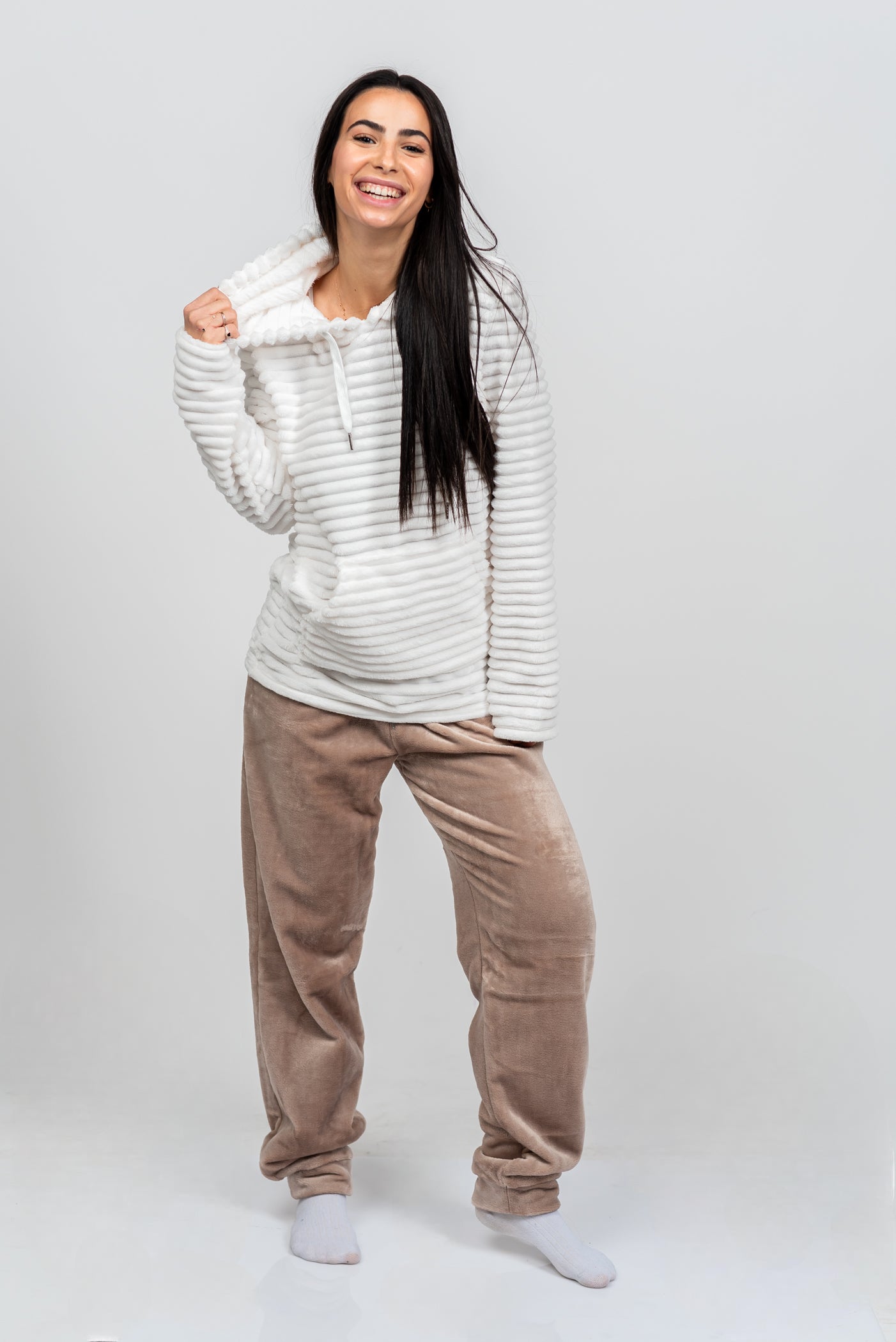 הסט המושלם להתכרבלות! סט הפליז המלא הזה מעוצב כולו מבד פליז מחורץ וסופר-מחמם, המבטיח שתישארי עטופה בנוחות מרבית גם בלילות הקרים ביותר. כולל קפוצ'ון עם שרוכים, כיס קנגורו נוח ומכנס בגזרת ג'וגר עם גומי מתכוונן. זהו לא רק בגד שינה; זהו הסט המפנק והאופנתי שתחכי ללבוש מרגע שתגיעי הביתה.