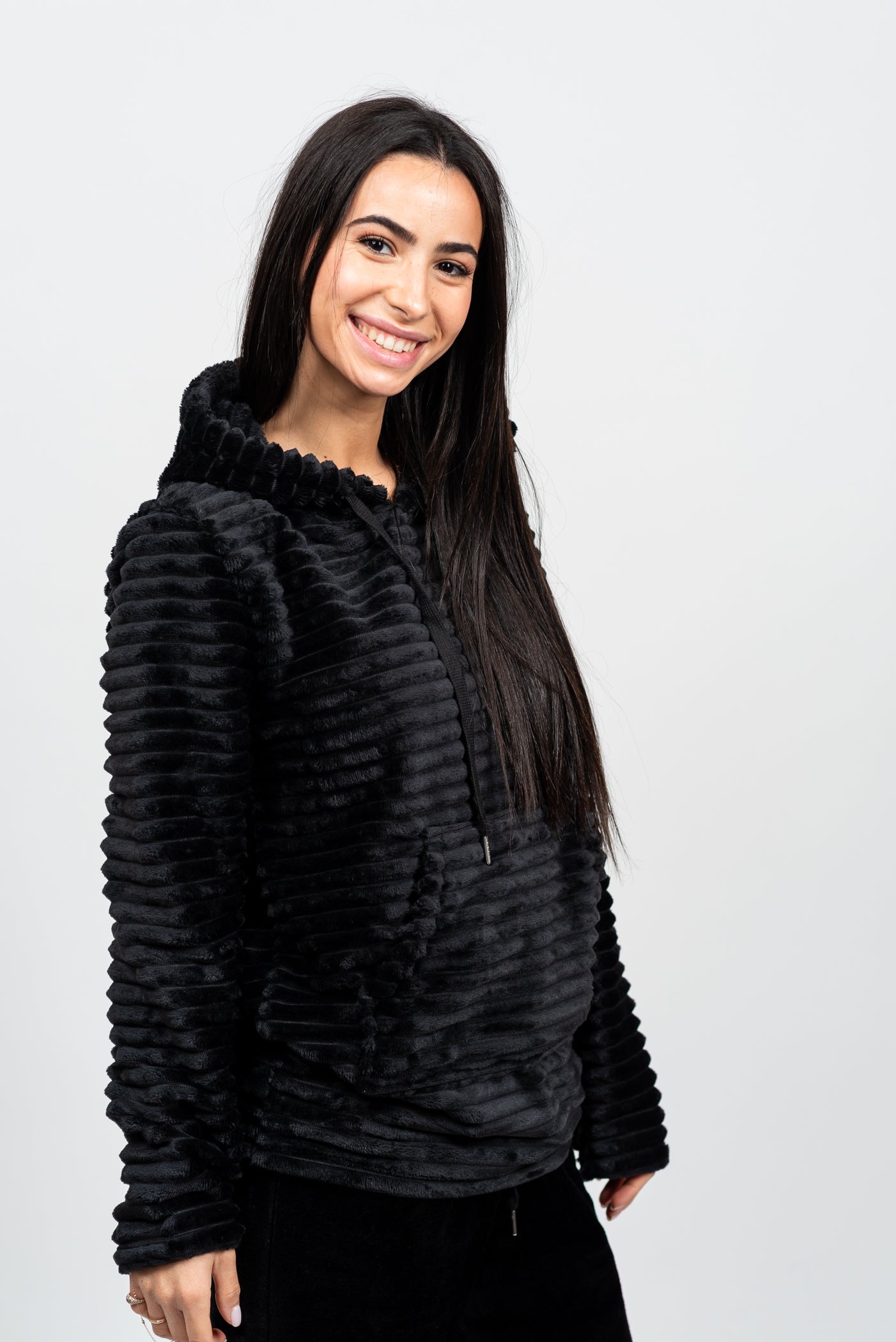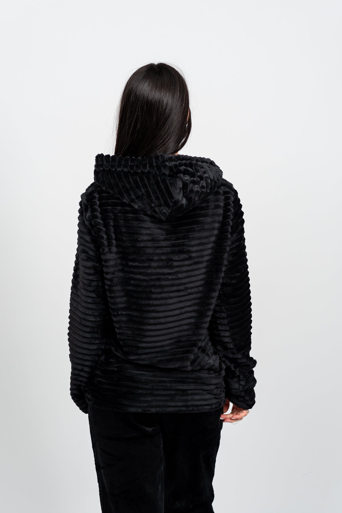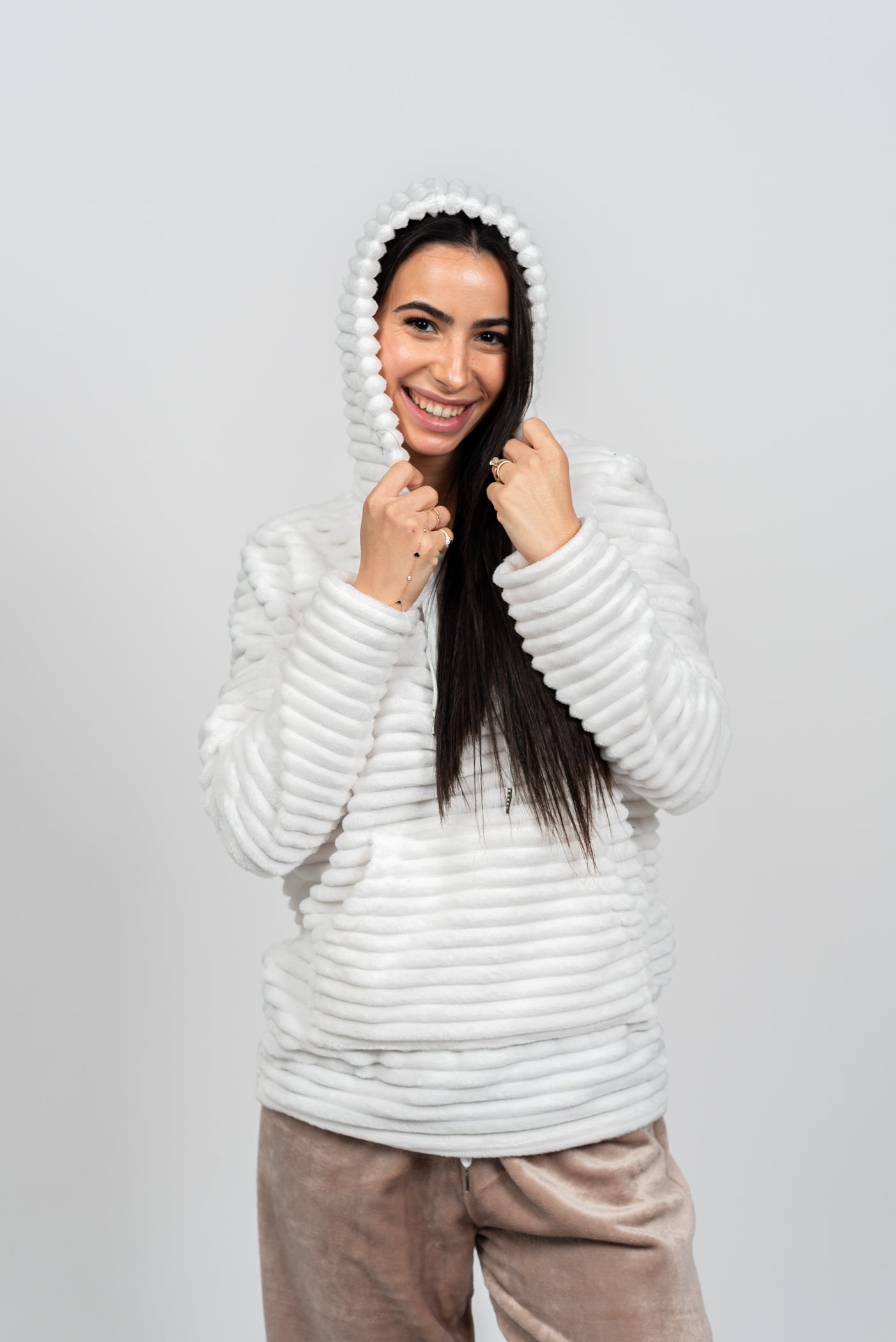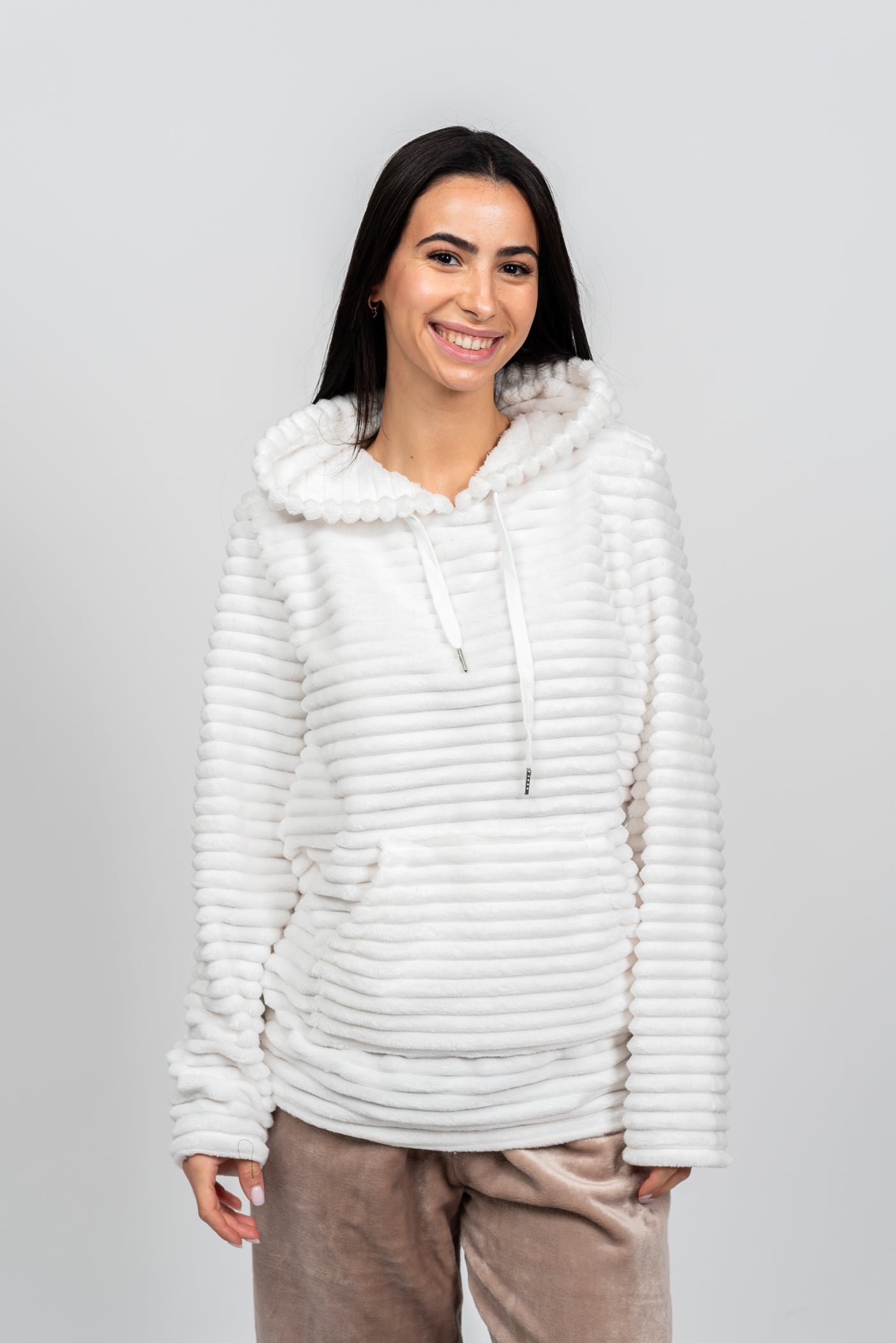הסט המושלם להתכרבלות! סט הפליז המלא הזה מעוצב כולו מבד פליז מחורץ וסופר-מחמם, המבטיח שתישארי עטופה בנוחות מרבית גם בלילות הקרים ביותר. כולל קפוצ'ון עם שרוכים, כיס קנגורו נוח ומכנס בגזרת ג'וגר עם גומי מתכוונן. זהו לא רק בגד שינה; זהו הסט המפנק והאופנתי שתחכי ללבוש מרגע שתגיעי הביתה.