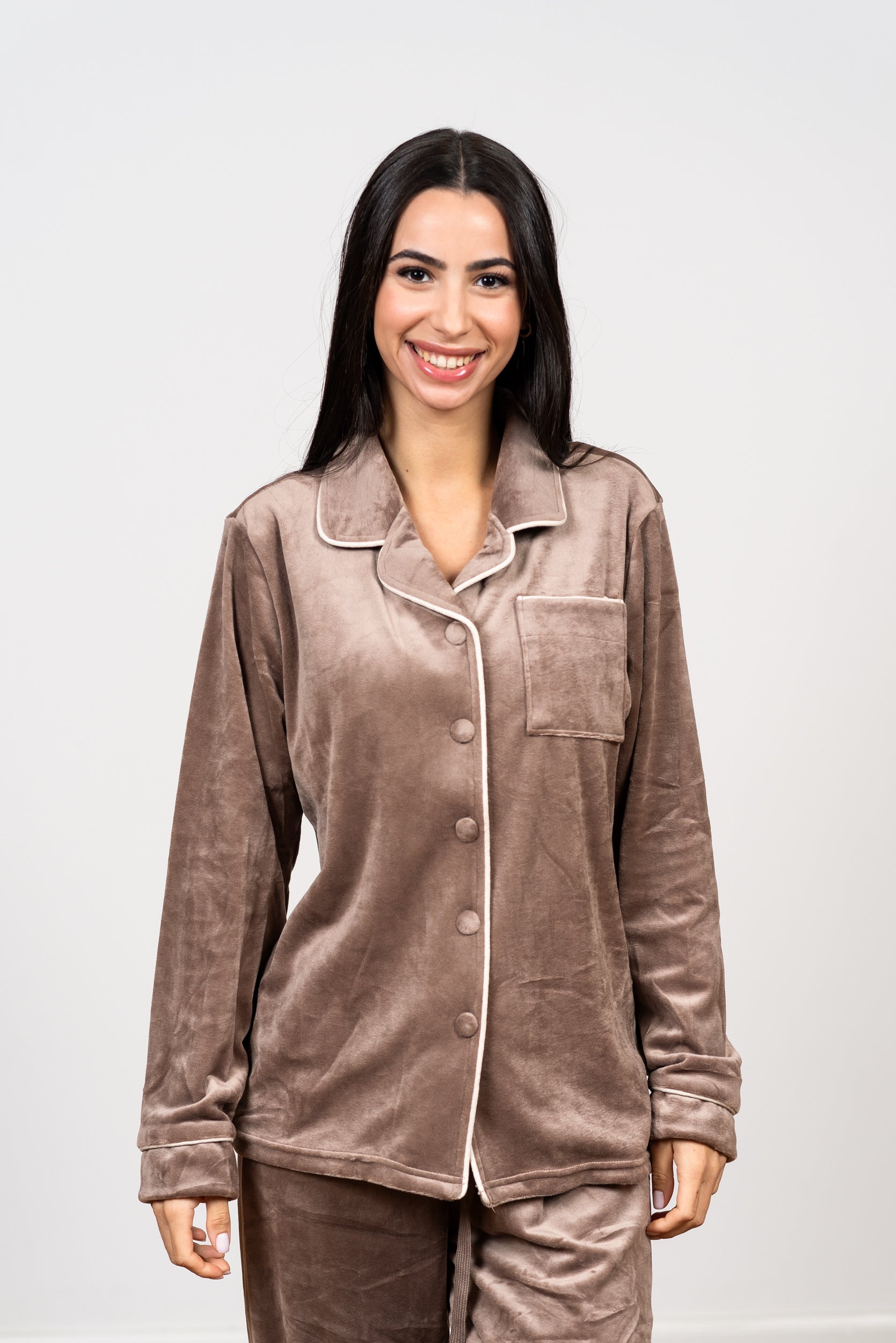 שילוב מושלם בין חמימות לשיק! הפיג'מה המכופתרת הזו עשויה מבד קטיפה רך ונעים במיוחד, המעניק בידוד מושלם לקראת הלילה. הפיג'מה מעוצבת בגזרה קלאסית: חולצה מכופתרת עם כיס דקורטיבי, ומכנס בגזרה ישרה ונינוחה. גימורי הפייפינג (פסים מנוגדים) מדגישים את קווי המתאר ומעניקים מראה אלגנטי ועל-זמני. זוהי הבחירה המושלמת למי שמחפשת סטייל מוקפד וחמימות מקסימלית.
