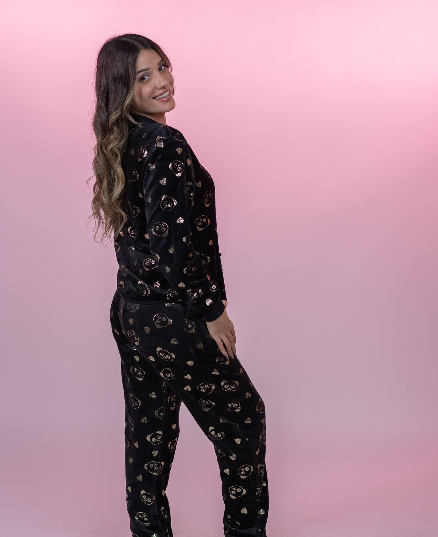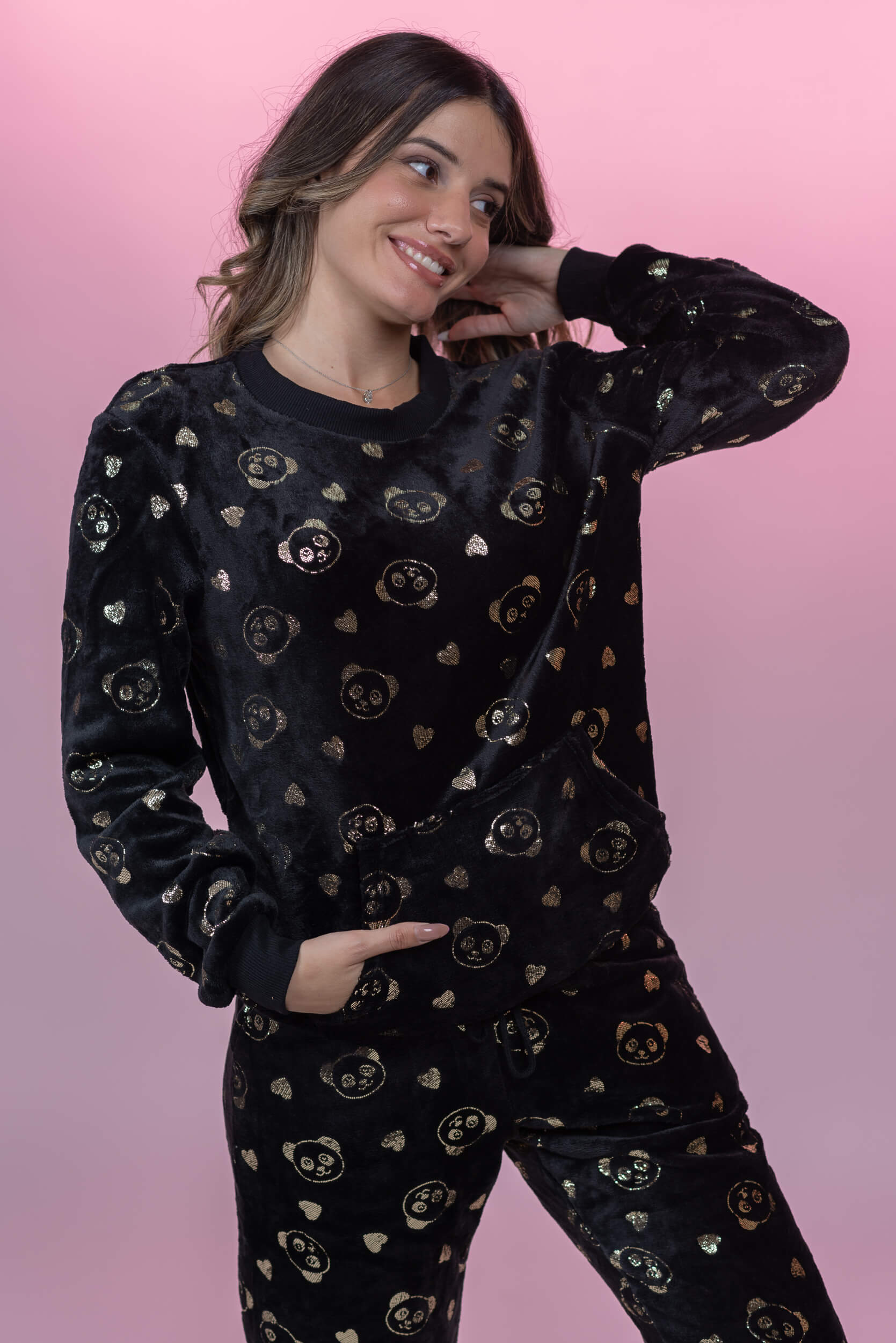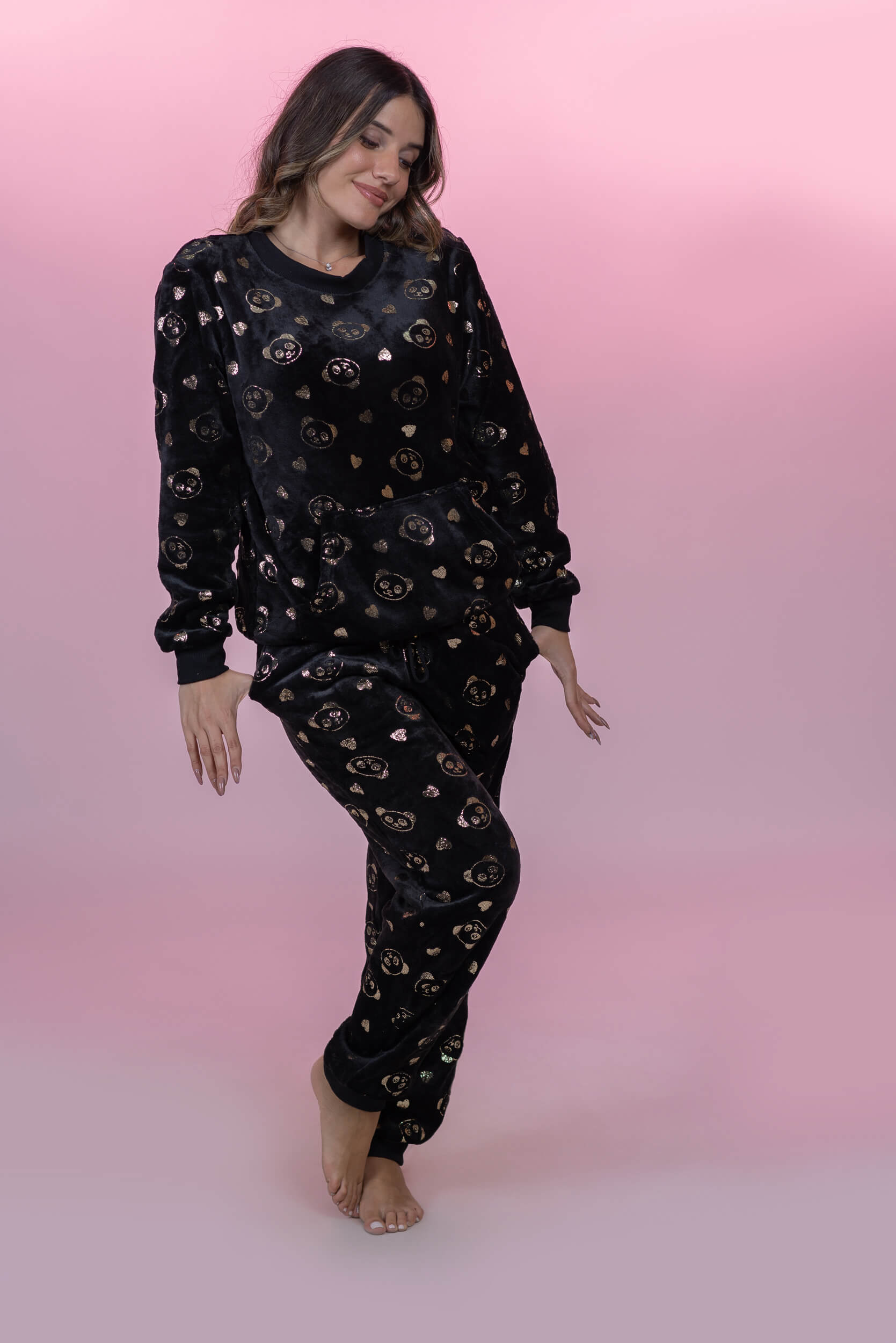 סט פיג׳מה פליז עם דובי מזהב עם מכנס תואם